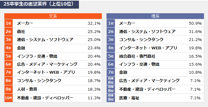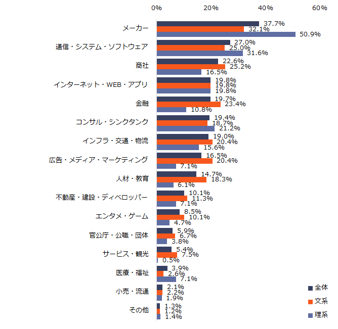 現在の志望業界を伺うと、トップは「メーカー」(37.7%)でした。文系理系いずれも第1位は「メーカー」(文系:32.1%、理系:50.9%)でしたが、第2位は、文系「商社」(25.2%)、理系「通信・システム・ソフトウェア」(31.6%)で順位に差が見られました。