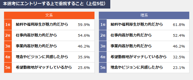 本選考にエントリーする上で重視することを伺うと、文系と理系で最もポイントに開きがあったのは「理念やビジョンに共感したから」で、文系が12.8ポイント高い結果になりました。(文系:35.9%、理系:23.1%)。