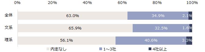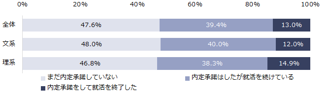 現在の内定数を伺うと、文系は34.1%(1~3社:32.5%、4社以上:1.6%)、理系は43.9%(1~3社:40.6%、4社以上:3.3% )が内定を得ていることが分かりました。すでに内定を得ている方に承諾状況を伺うと、39.4%が「内定承諾はしたが就活を続けている」と回答しました。