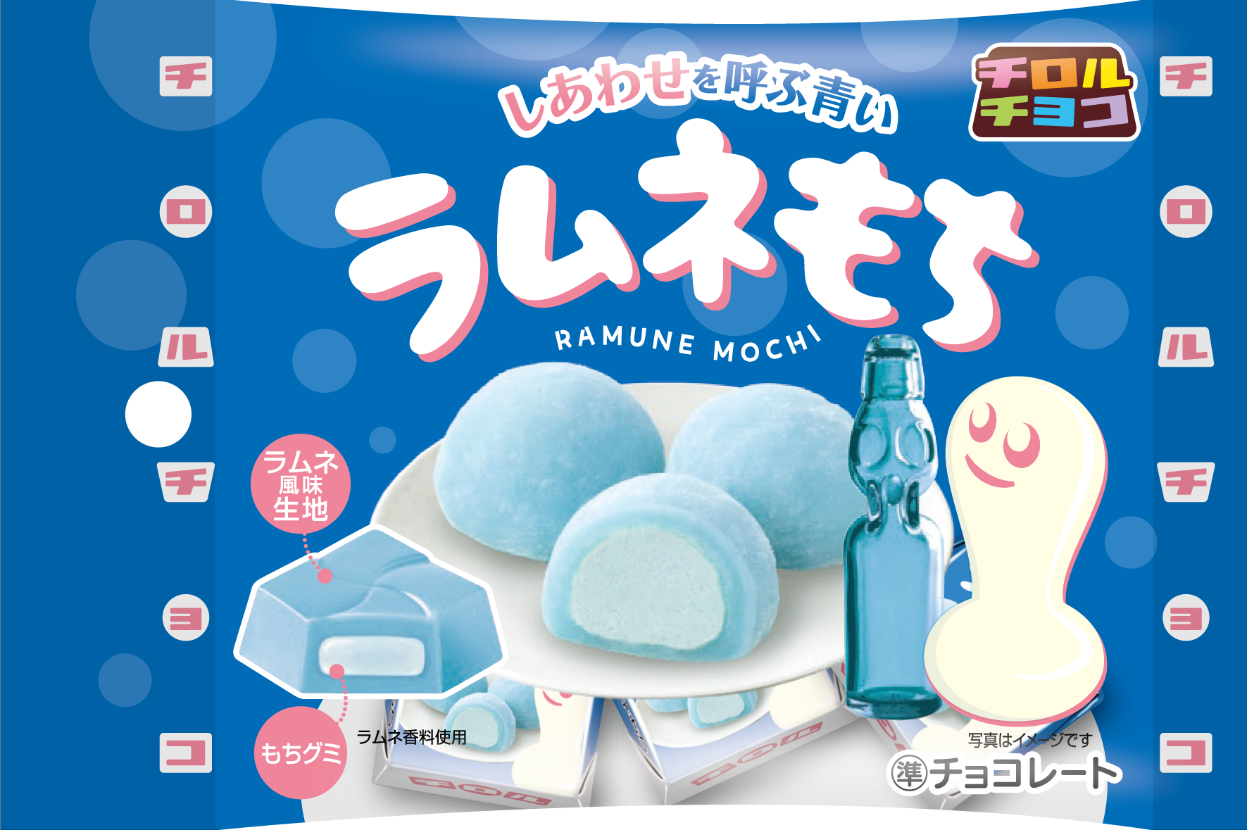 ラムネのさわやかな風味ともちもちとしたもちグミを組み合わせました。昔懐かしいラムネの味わいで子どもから大人まで楽しめます。パッケージは青い水玉デザインでさわやかなラムネの味わいを表現し、青とピンクを基調としたローソンカラーで仕上げました。
