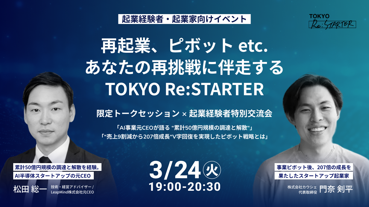 テーマ: 「【起業経験者・起業家向けイベント】 再起業、ピボット、etc. 起業家の再挑戦に、伴走する TOKYO Re:STARTERイベント。限定トークセッション × 起業経験者特別交流会」
