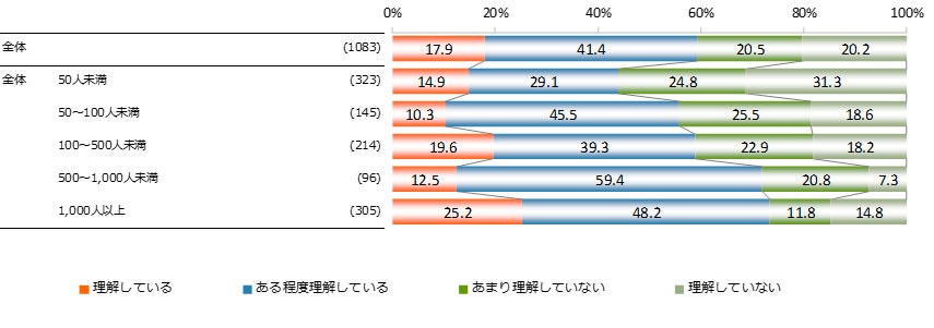 また、勤務先のコンプライアンスポリシーの理解度も従業員数が多いほど高く、500人以上では約7割が「理解している」「ある程度理解している」と回答した。一方、従業員数が50人未満では約4割に留まった。