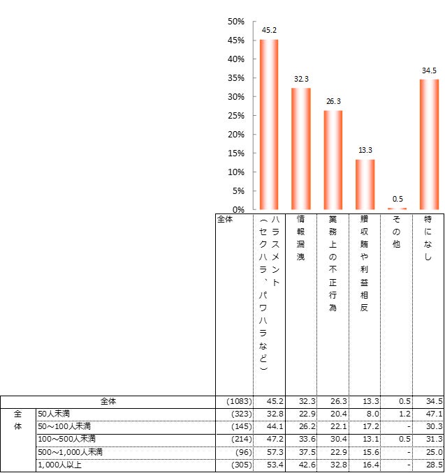 勤務先でコンプライアンス違反の発生リスクがあると感じる問題については、「ハラスメント(セクハラ、パワハラなど)」が全体の45.2%となり最も高かった。