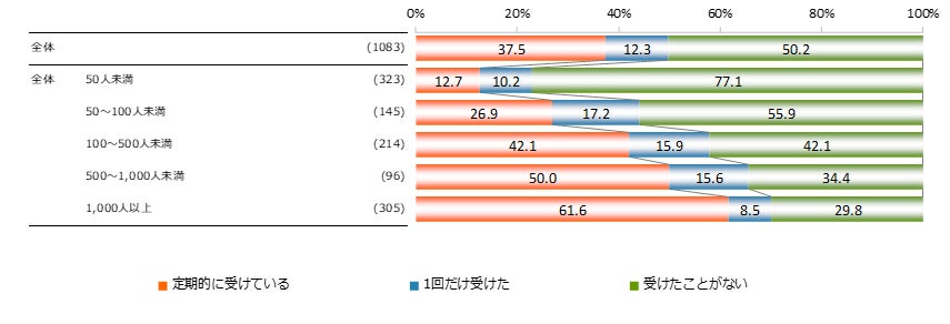 勤務先でコンプライアンス研修を「定期的に受けている」(37.5%)、「1回だけ受けた」(12.3%)を合わせると、49.8%だった。勤務先の従業員数が多いほど受講率が高く、従業員数1,000人以上では約7割を占めた。
