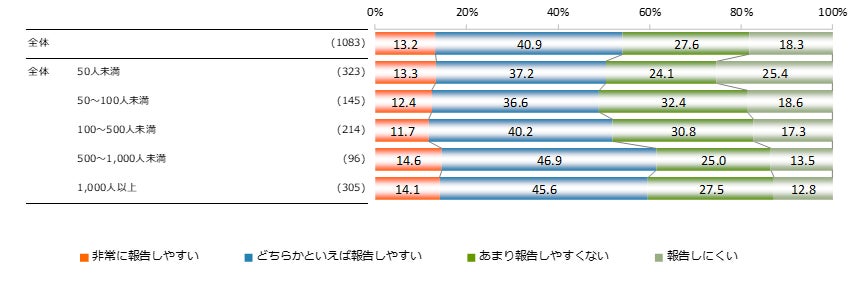 従業員数別で見ると、従業員数が少ないほど「報告しにくい」と感じている割合が高く、50人未満では25.4%となった。