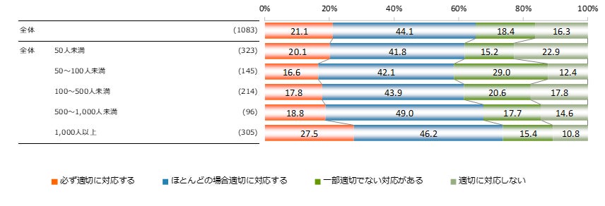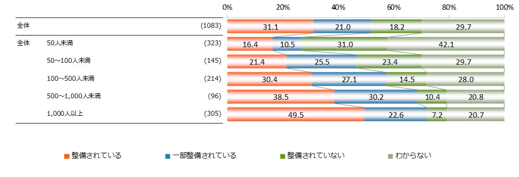 また、コンプライアンス違反を報告する仕組みについては、「整備されている」が全体の31.1%、「一部整備されている」が21.0%となり、合わせると52.1%だった。従業員数が多いほど整備されており、1,000人以上では72.1%だった。