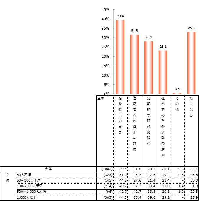 また、コンプライアンス違反を未然に防ぐために会社に求めるサポートは、「相談窓口の充実」が39.4%、「違反者への厳正な対応」が31.5%だった。