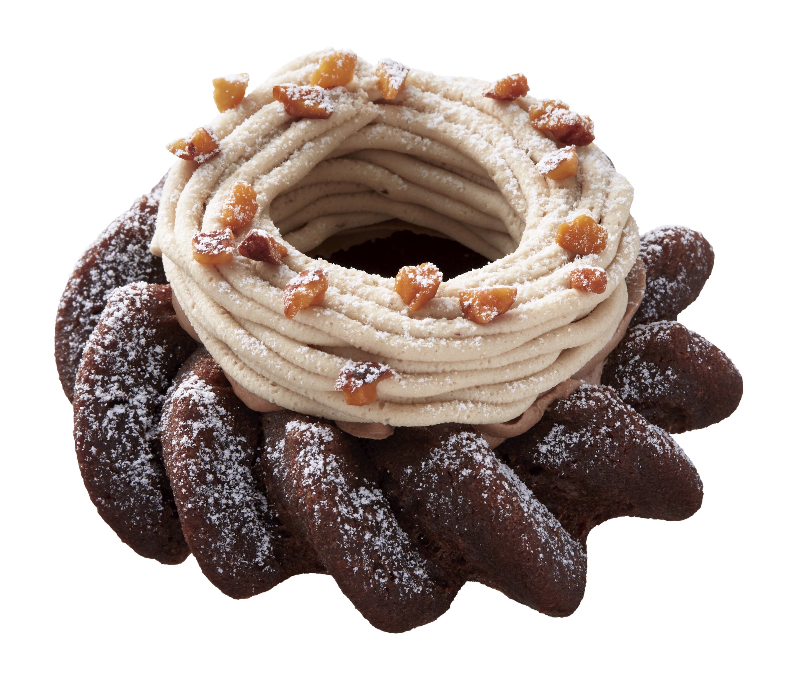 ガトーショコラドーナツに、ショコラホイップとマロンホイップを絞り、キャンディングアーモンドをトッピング。