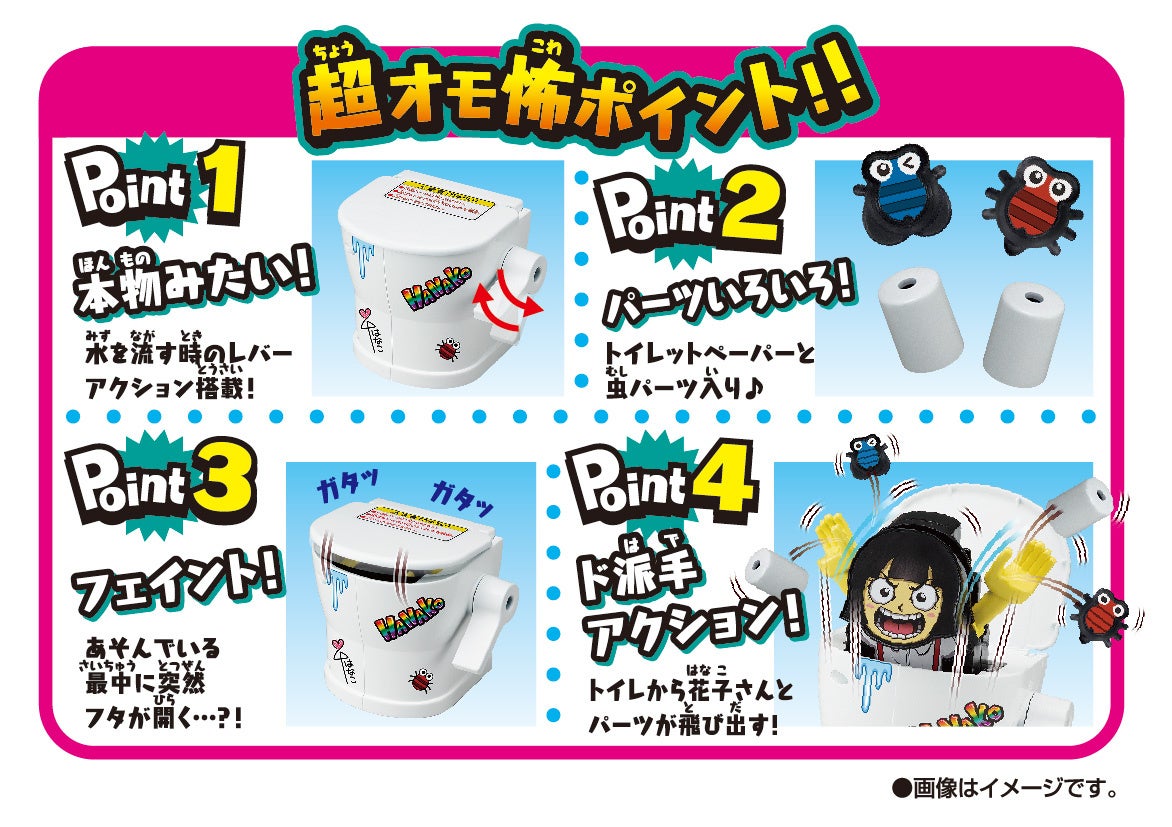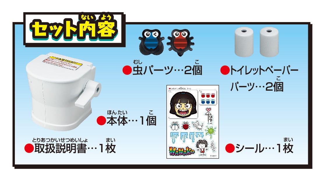 子供たちの間で知られている学校の怪談や都市伝説に出てくる「トイレの花子さん」をモチーフにした、怖いけど面白い、ドキドキアクションゲーム「ドッキリトイレの花子さん」です。『ドッキリトイレの花子さん』の遊び方は簡単。トイレのレバーを1~3回、好きな回数下げて次の人に交代し、次の人も同じようにレバーを下げて、それを繰り返していきます。運が悪いと突然「花子さん」「虫」「トイレットペーパー」が飛び出します。飛び出した人が負けになる、ビックリ!ドッキリ!のアクションゲームです。(電池不要です)