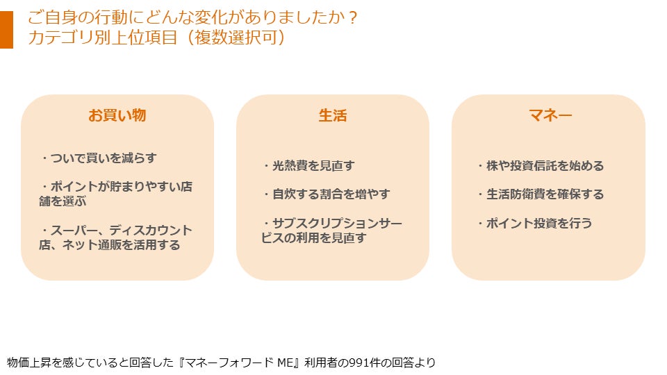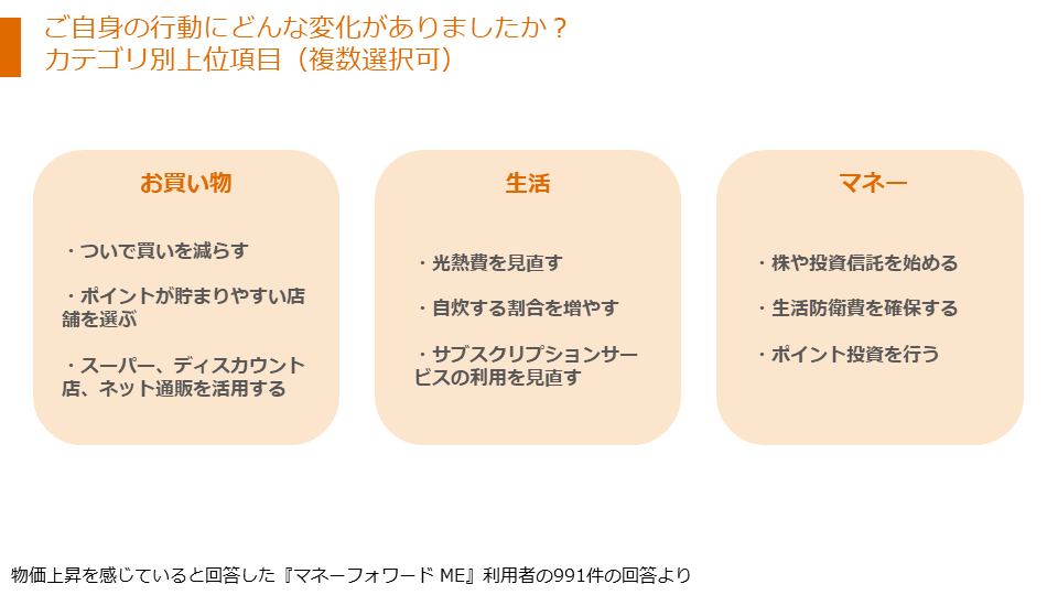 また、回答を「お買い物」「生活」「マネー」の3つのカテゴリ別でみると、「自炊する割合を増やす」「サブスクリプションサービスの利用を見直す」「ポイント投資を行う」なども行動の変化として上位に挙がりました。