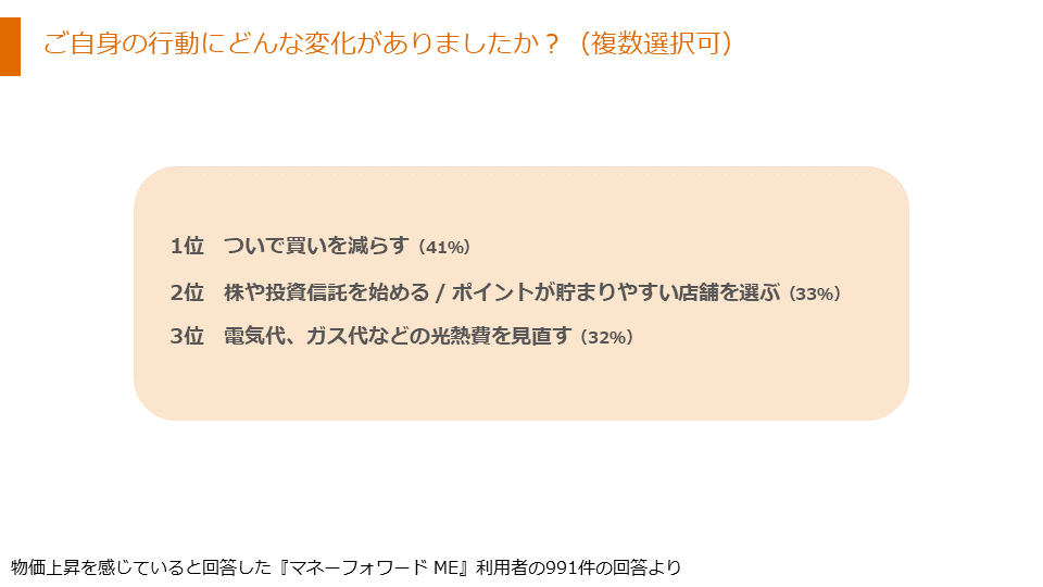 そして利用者自身が変えた行動として、1位「ついで買いを減らす(41%)」、同率で2位「株や投資信託を始める(33%)」「ポイントが貯まりやすい店舗を選ぶ(33%)」、3位「電気代、ガス代などの光熱費を見直す(32%)」が挙げられました。