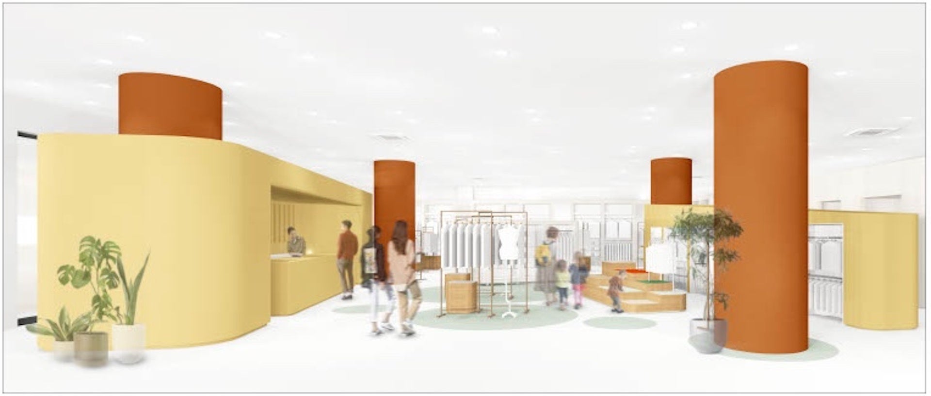 店舗正面2箇所の入口から店内に入ると、左右にメンズ、ウィメンズのフロアが大きく広がりながら、中央には〈BEAMS mini〉などのキッズ商品をお子様ご自身の手が届きやすい低めの棚も活用しながら展開し、どんなご来店シーンでもお買い物を楽しめる空間となっています。店内は”手に届くリゾート”を内装テーマとしており、白をベースカラーとしながら優しい色調を使用し、曲線を活かした壁面や角をとった什器を採用することで、風が抜けるような、ゆったりとしたイメージを表現しています。