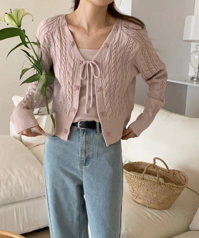 リボンモチーフがキュートなカーディガンとキャミソールのセットアップニット。ライトブルーデニムと合わせた、カジュアルガーリーコーデの完成。