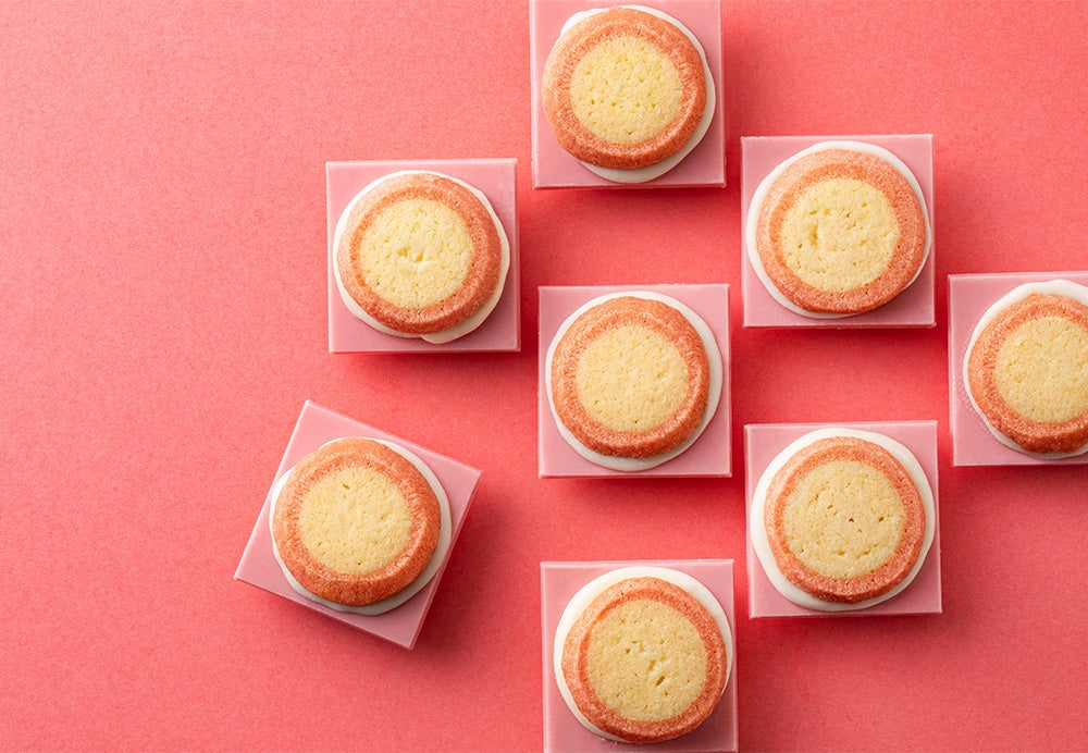 ブランド代表作。果実やナッツのコンフィチュールをとろっととじこめた 贅沢なコクの宝石ショコラを、カリッと香ばしいクッキーに重ねました。
