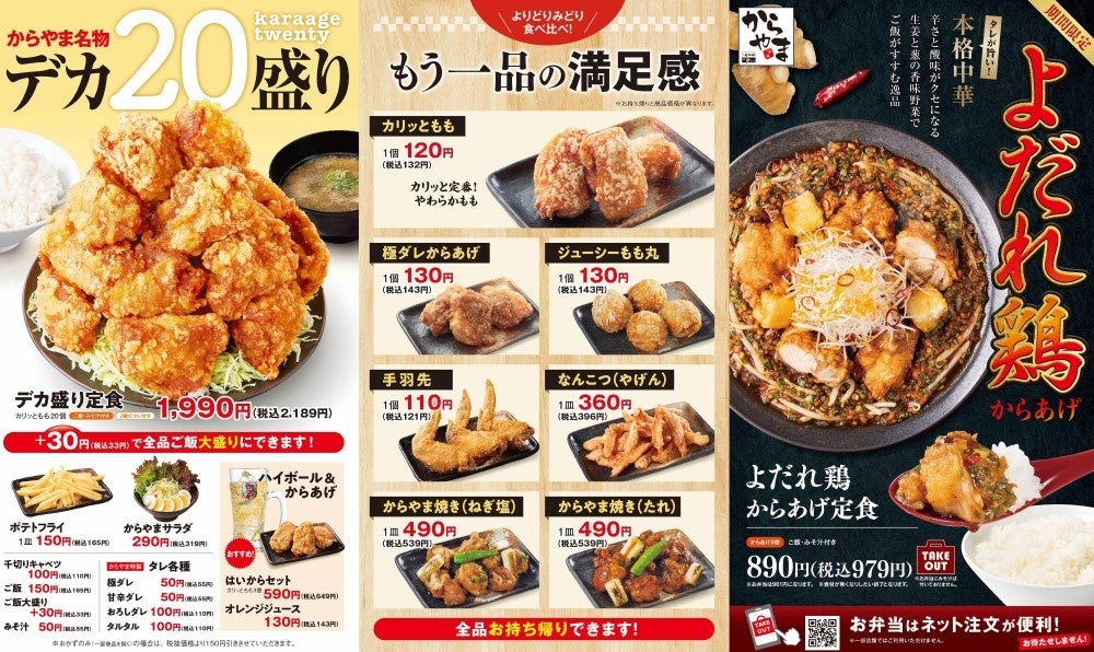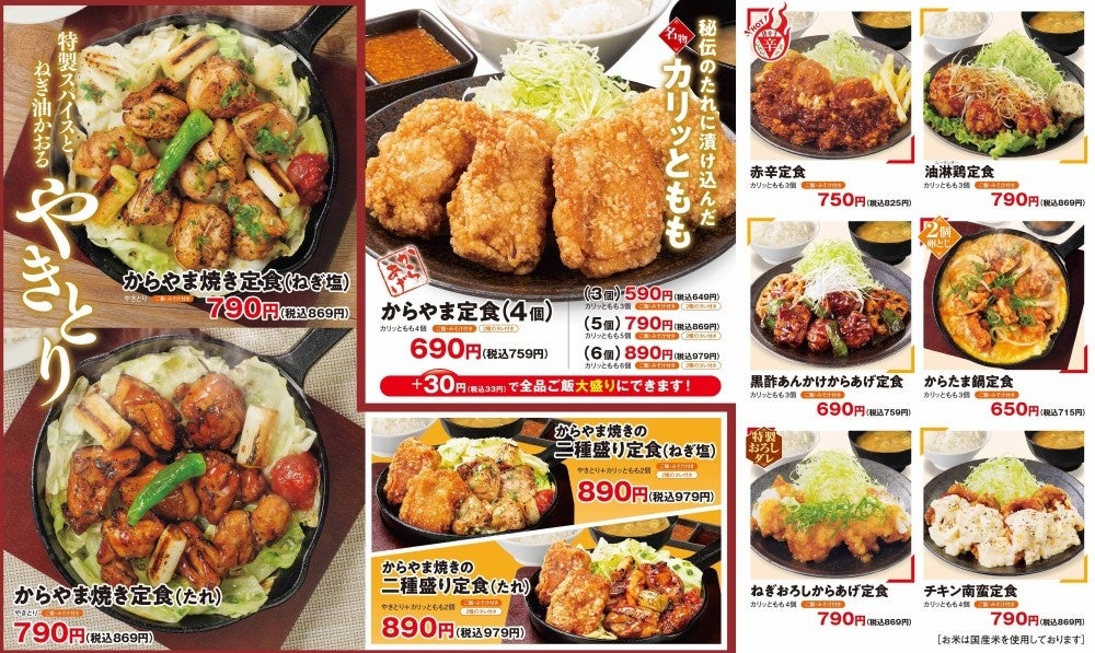 2023年3月、とことん「カリッともも」をお楽しみいただける11種類の定食に加え、独自の調理法で揚げ焼きにすることで香ばしくジューシーな、ご飯のおかずとして楽しめる新感覚のやきとり「からやま焼き」が仲間入り。