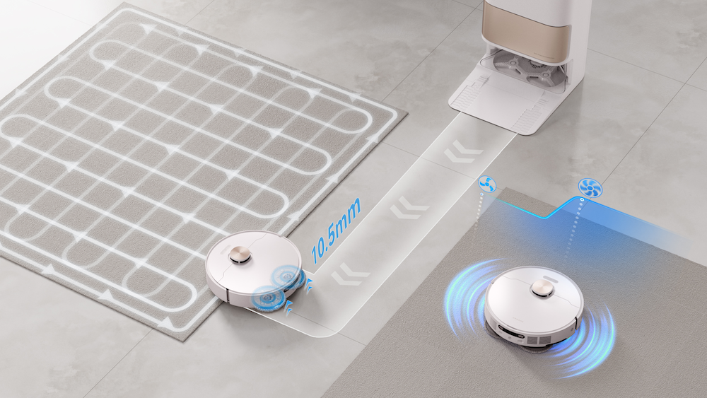 カーペットの清掃では、毛足の長いカーペットがある場合、L10s Pro Ultra Heatは一旦ベースに戻り、モップを取り外してから、カーペットに深く付着しているゴミを吸い取る、最も強力なカーペット清掃を行います。毛足の短いカーペットがある場合、カーペットを濡らさないように、 10.5mm*までモップをリフトアップし、カーペット清掃を行います。とても小さなマットの場合は、吸引により引きずる恐れがあるため認識センサーにより、カーペットを回避して清掃を続行します。
