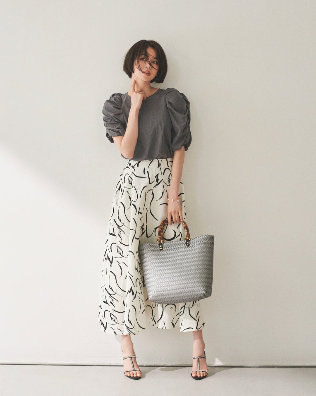 トップス(¥7,920)/スカート(¥8,690)/バッグ(¥9,350)/サンダル(¥8,690)/ピアス(¥3,190)/バングル(¥4,290)