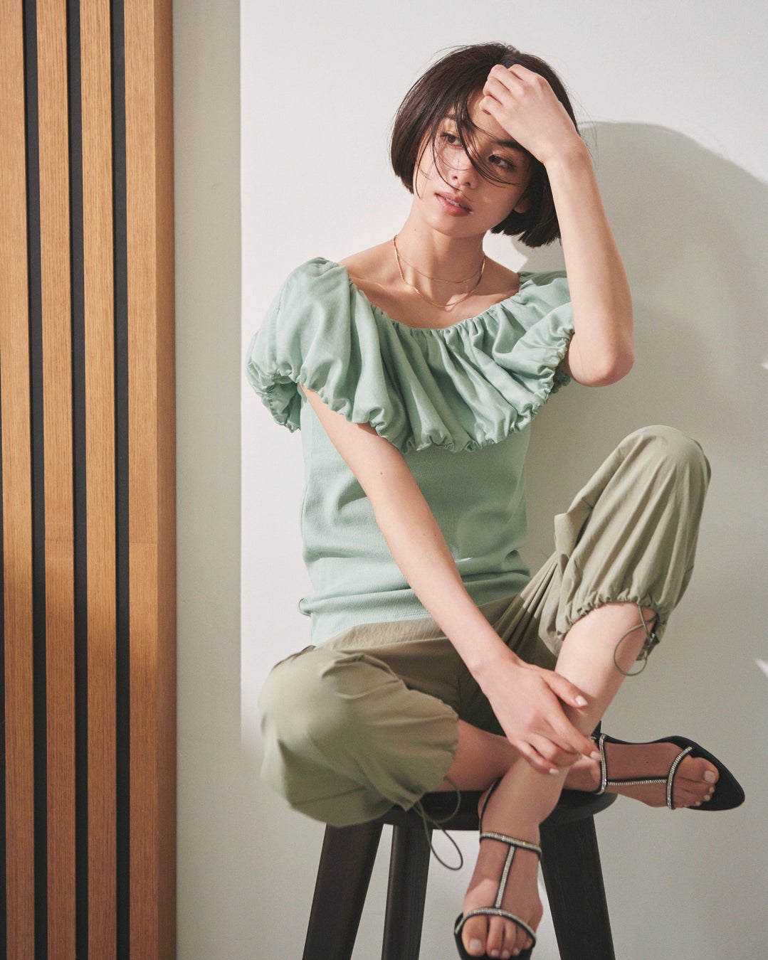 ニット(¥7,590)/パンツ(¥8,690)/インナー(¥4,290)/バッグ(¥7,590)/サンダル(¥8,690)/ネックレス(¥4,950)