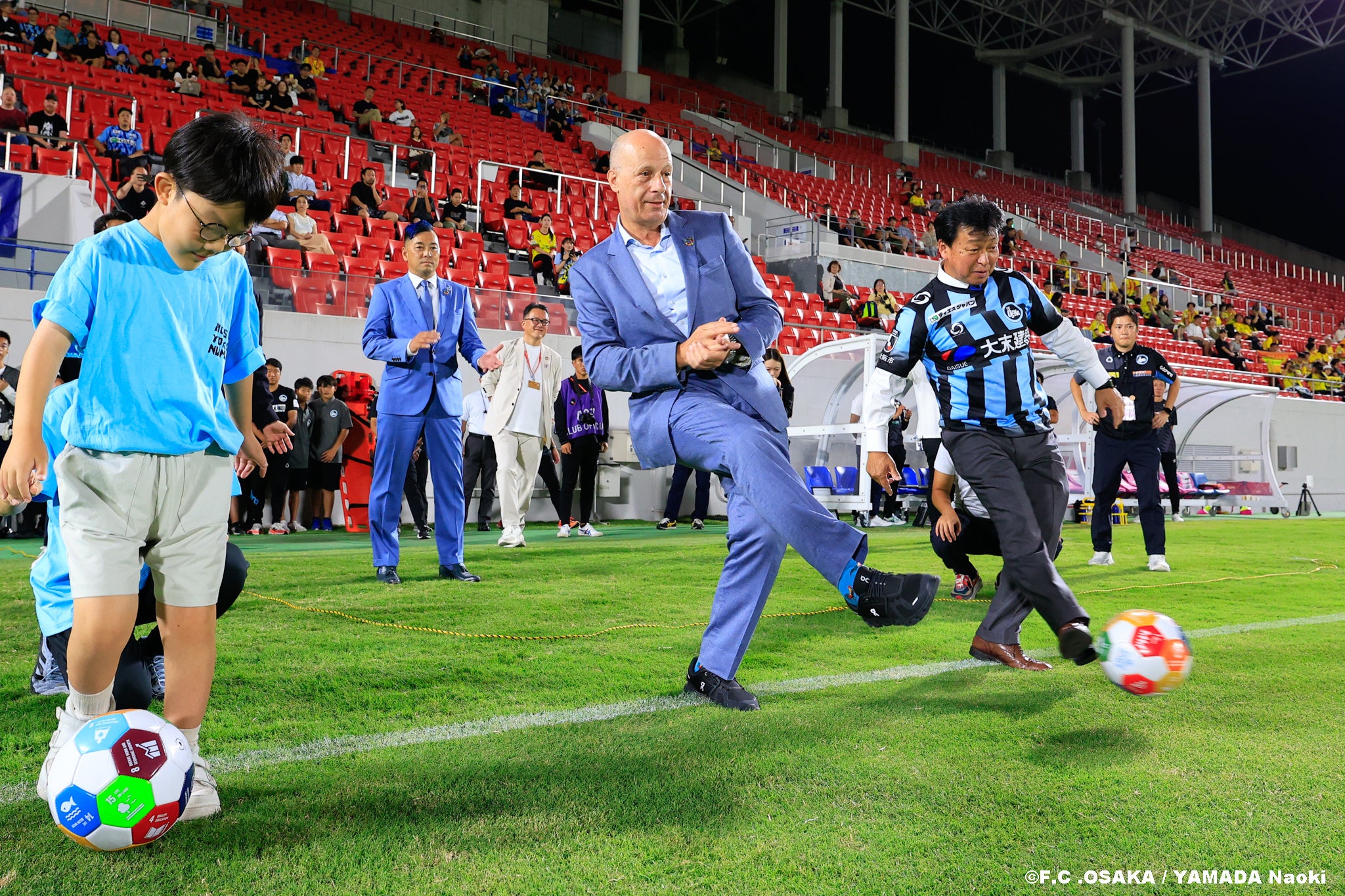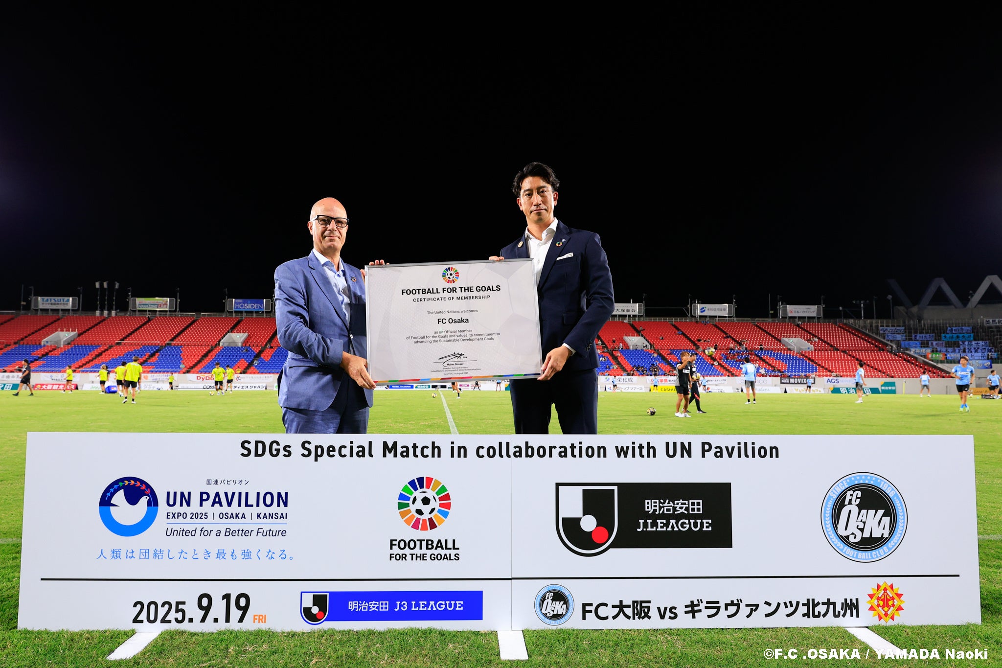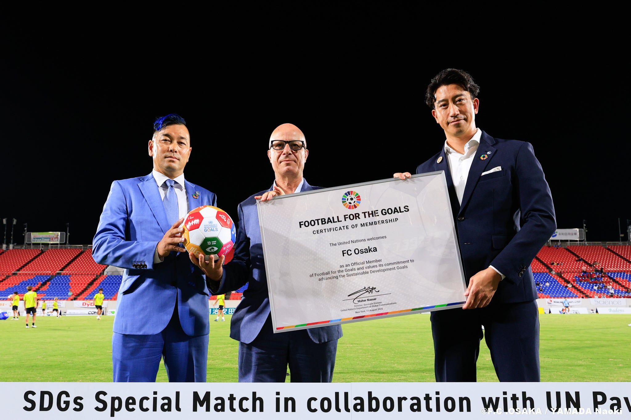 本試合には、国連事務次長補 兼 2025年大阪・関西万博 国連陳列区域代表であるマーヘル・ナセル氏をお迎えし、8月11日にFC大阪の加盟が承認された 「Football for the Goals(FFTG)」※1 の加盟式、さらに SDGsボールを使用したキックインセレモニー を実施いたしました。