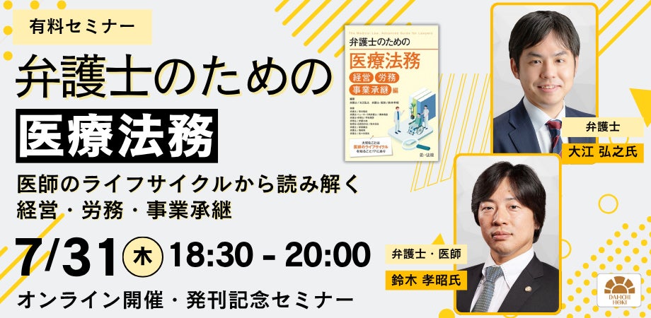 今回も新刊『弁護士のための医療法務 経営・労務・事業承継編~大切なことは医師のライフサイクルを知ること!?にあり~』をご執筆いただいた弁護士の大江氏、医師・弁護士の鈴木氏のお二方がご登壇!
