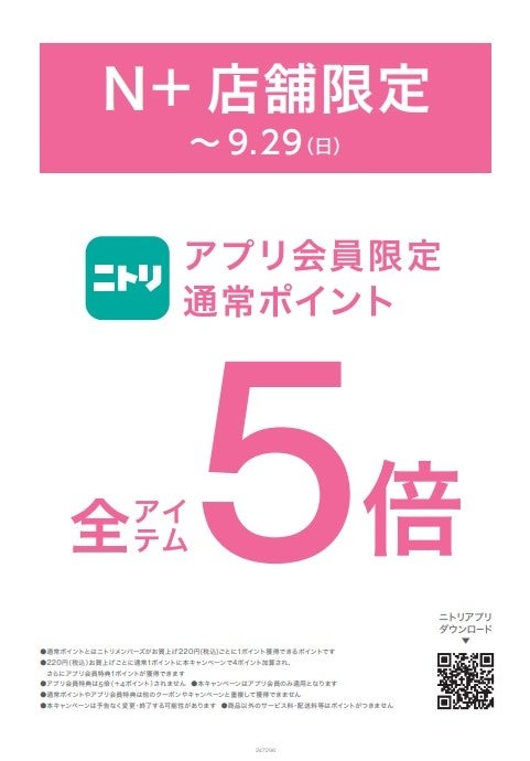 社⻑:⾼橋陵)は、N+全店(全国45店舗)を対象とした"ニトリアプリ会員限定 通常ポイント5倍キャンペーン" を開催いたします。2024年9⽉20⽇(⾦)〜9⽉29⽇(⽇)の10⽇間のキャンペーンです。