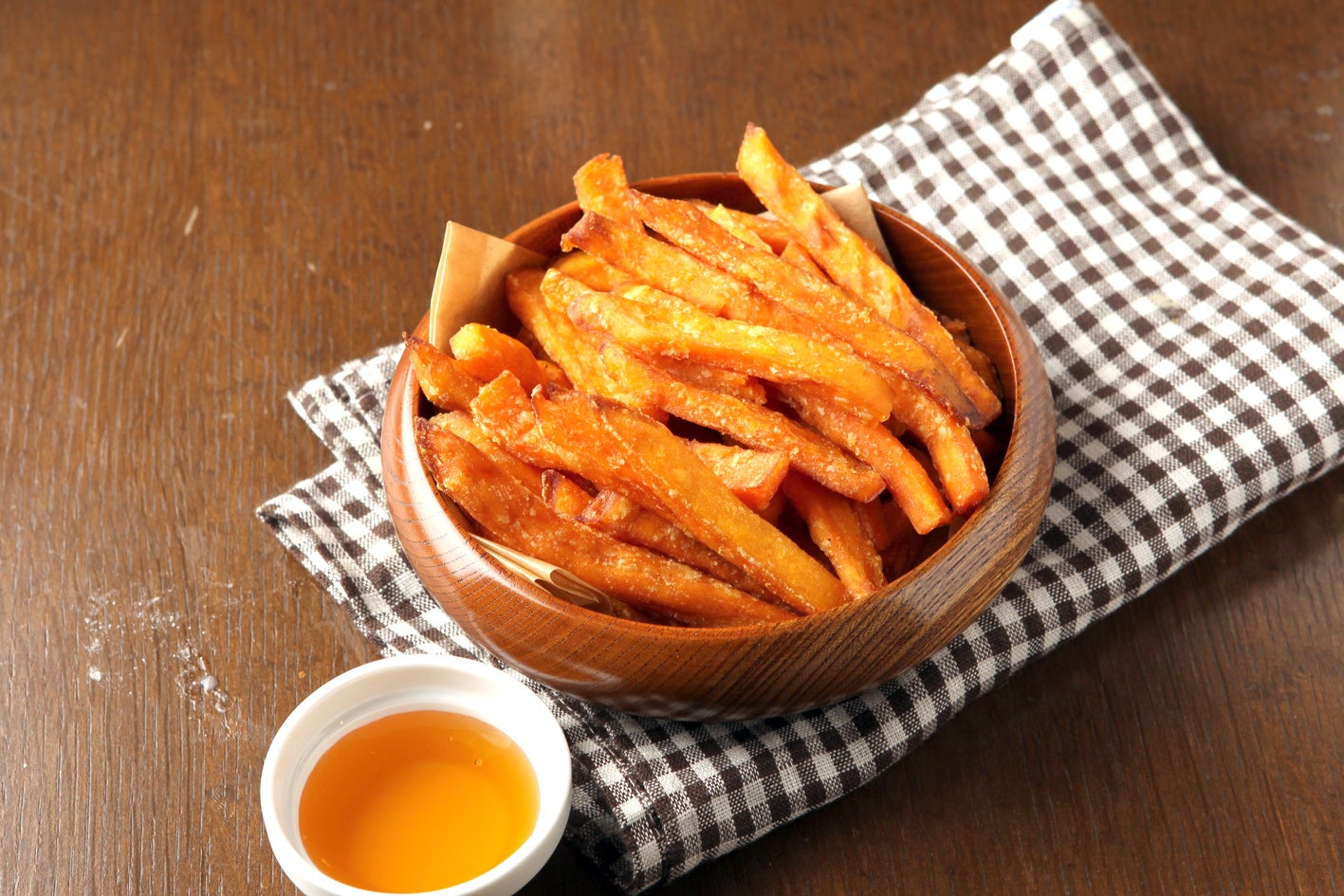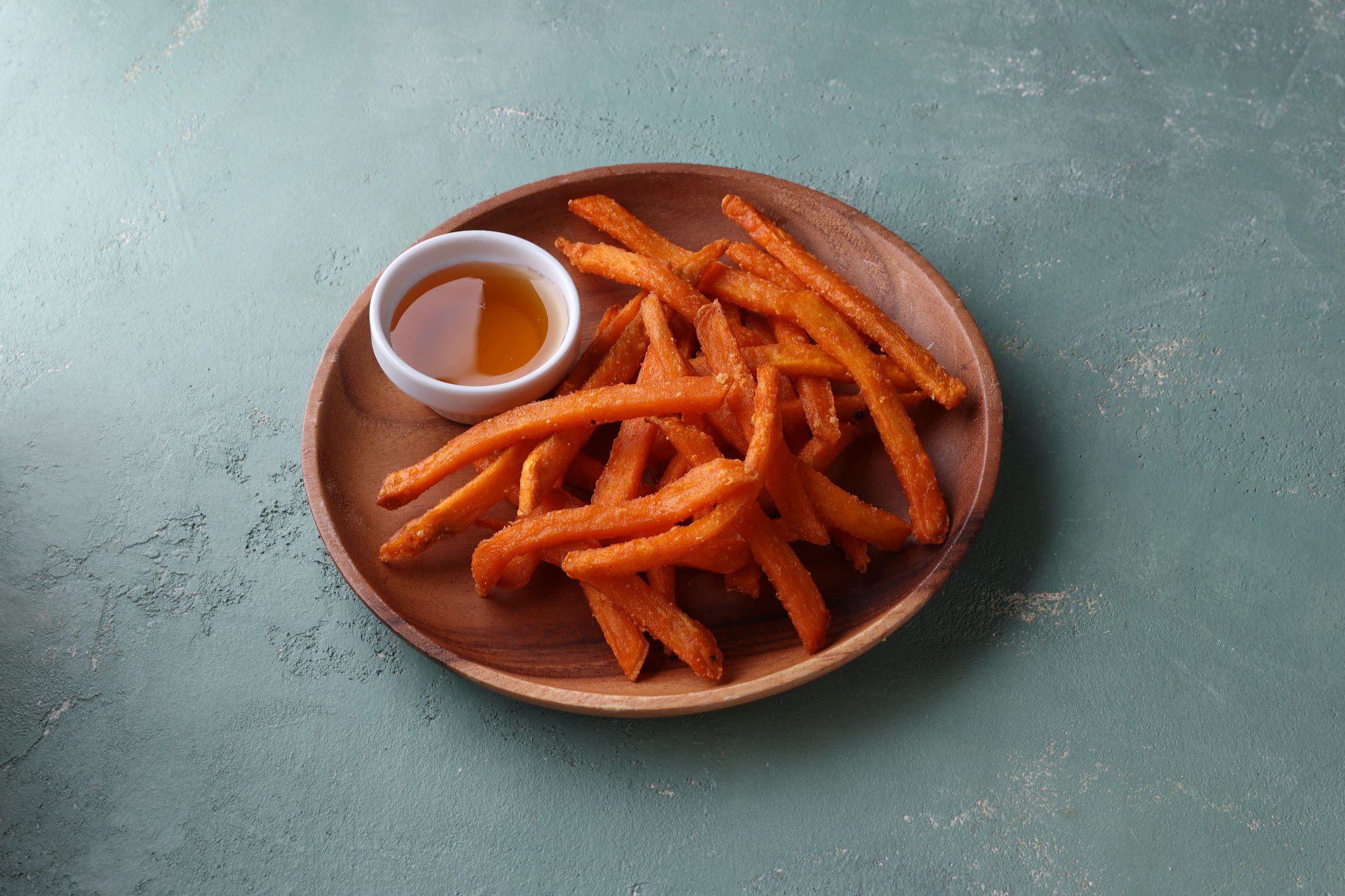 仕上げに創業者テリー氏から伝わる秘伝のスパイスを振りかけた、サツマイモのフレンチフライ。ハニーメープルにつけてお召し上がりください。