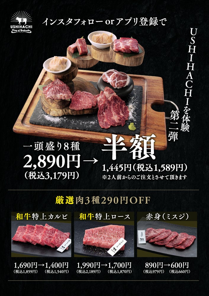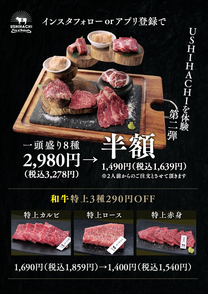 第二弾は11月6日(月)~11月19日(日)の期間限定で、A4黒毛和牛に赤身とホルモンを加えた人気の盛り合わせ「USHIHACHI一頭盛り【8種】」を半額にてご提供。また、店舗ごとに和牛特上カルビや特上赤身といった厳選メニューが290円オフ。ぜひ、11月は「USHIHACHIの焼肉体験」をお得にお楽しみください!