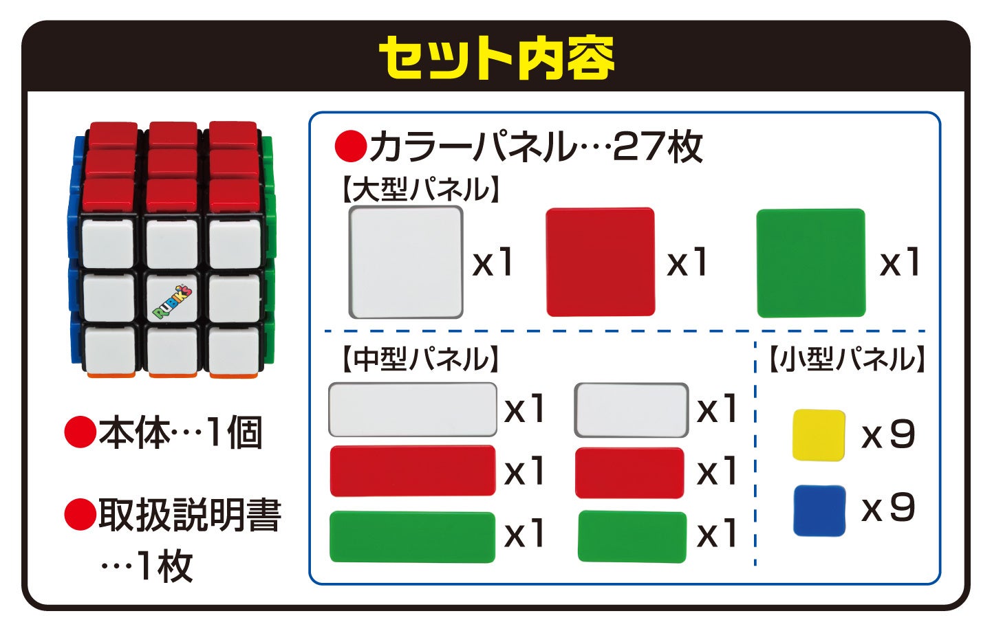 本商品は、通常のルービックキューブ同様の遊びに加え、本体表面にカラーパネルをつける事により難易度を変え、新たな立体パズルとして楽しむことができる新感覚パズルです。カラーパネルは、大型・中型2種・小型タイプの計27枚が付属しています。大型(4マス分の正方形)や中型(長方形の2マス・3マス分)パネルを本体につけると、回せる箇所がロックされて動かなくなり、通常のルービックキューブのような動きや手順を使って揃える事が困難になります。また、小型パネルは1マスごとにつける形状で、6色キューブから5色や4色キューブに色数を減らすことができます。パネルをどこに、何を、いくつつけるかで遊びが広がりパズルとしての難易度も変わり、ルービックキューブをこれからはじめる初心者方から上位者まで、幅広く皆さんで楽しめる仕様になっています。