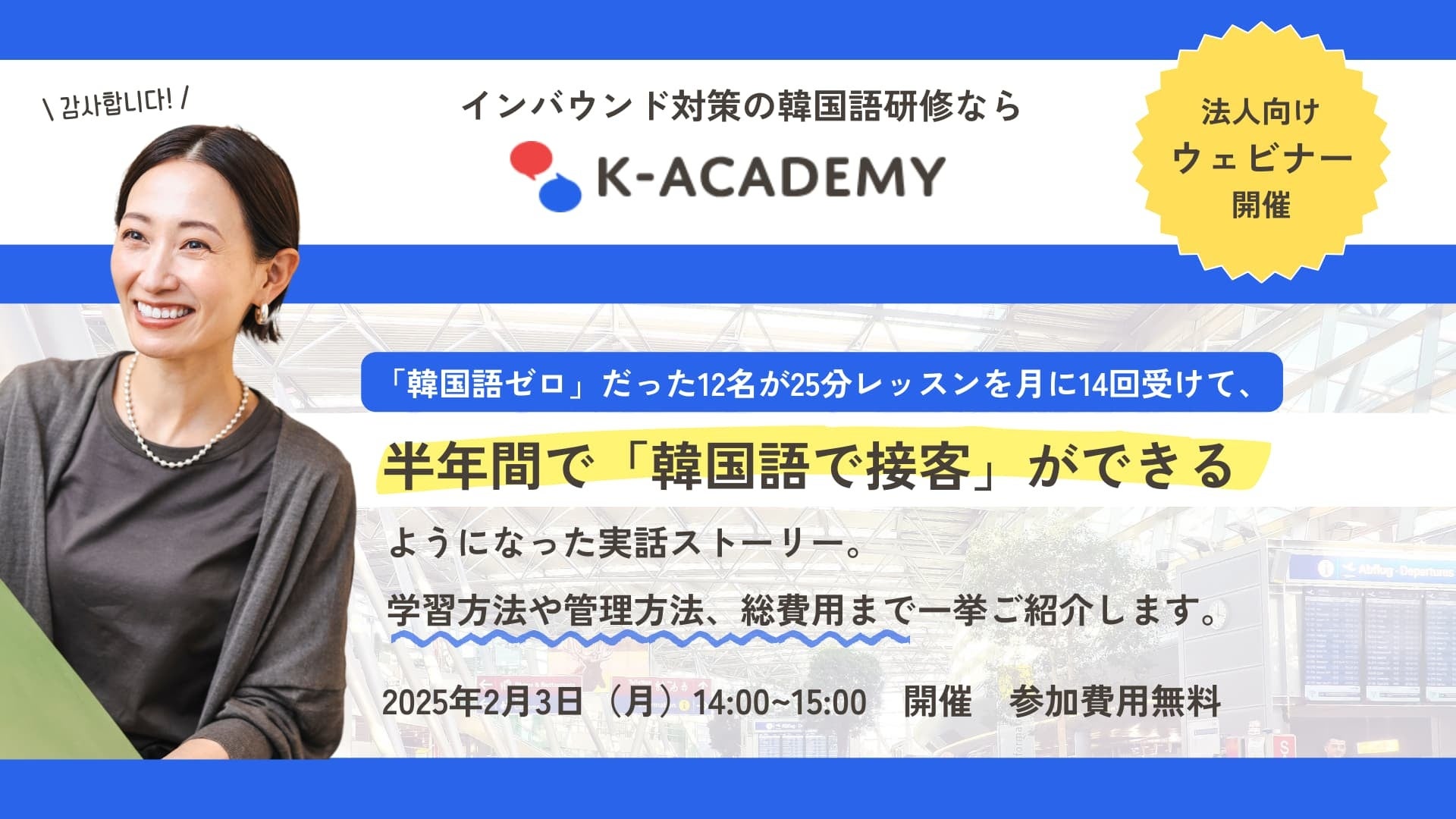【2月3日14時】 接客韓国語研修の成功例をまるっとご紹介する無料ウェビナー開催