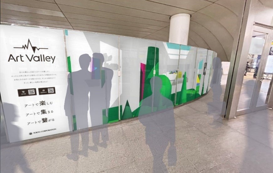 街と連携したプロジェクトの第1弾として、2023年1月23日~4月22日(※)の期間限定で、東急線渋谷駅ヒカリエ改札口周辺吹き抜けガラス面にアート作品とQRコードを掲出します。QRコードを読み込むと、ECサイトに遷移し、本サービス限定のフィジカル(物理的)・デジタル両方のアート作品を購入することができます。日常生活の動線である駅などからオンラインにつなぎ、掲載作品がその場で購入できるなど他サイトでは経験できない、購入体験ができます。