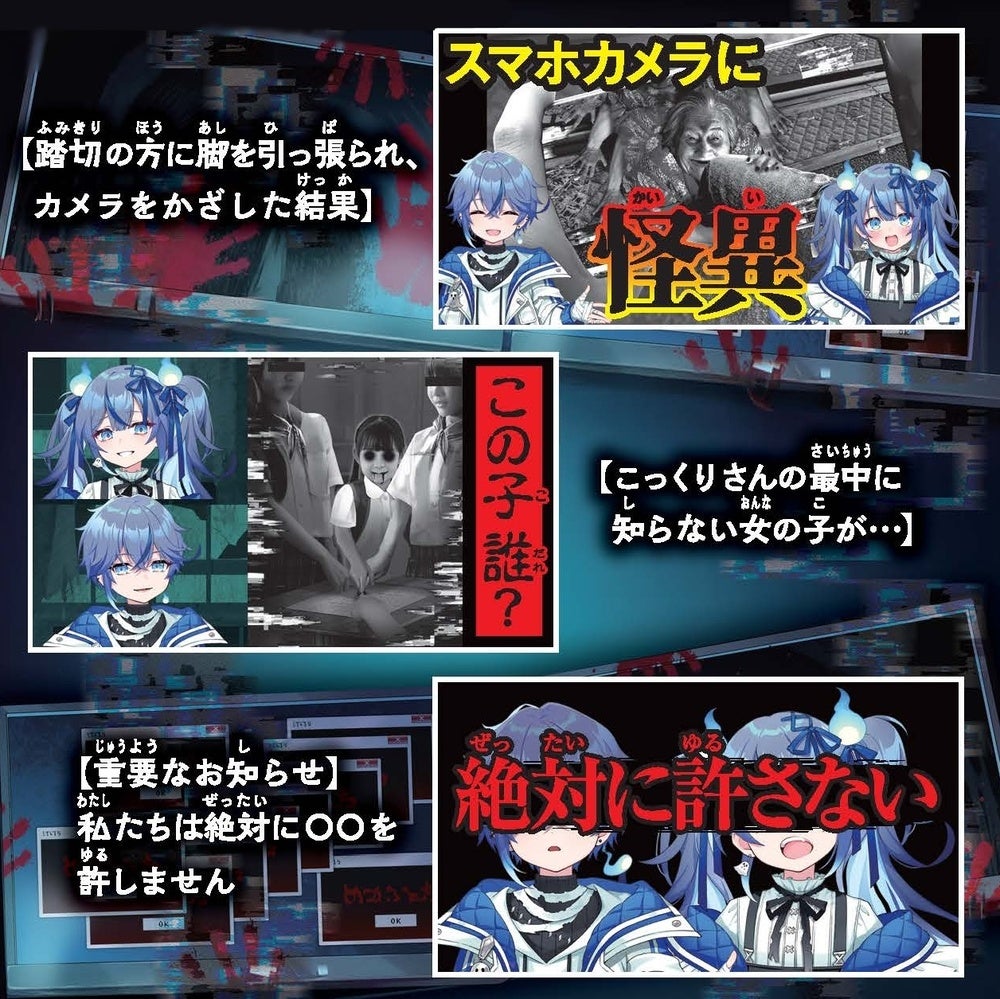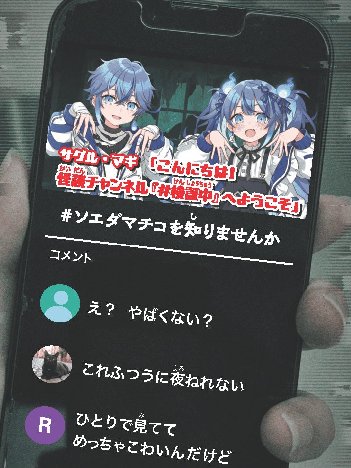 『【閲覧注意】呪われても知りません #スマホ #怪異 #VTuber配信者の謎』は、「ふたごのVTuber・サグルとマギの怪談配信」をテーマにしたモキュメンタリー(ドキュメンタリーの手法で制作したフィクション)ホラー小説です。サグルとマギのチャンネル「#検証中」では、「ふざけて生成AIで作った写真の女の子が、実体を持ち始める話」、「ARの位置ゲーにうつる怪異に殺されかける話」など、リスナーからの投稿怪談配信が人気急上昇中。恐怖画像満載の短編怪談を読んでいくと、徐々にふたりの暗い過去と怪談配信を続ける目的が明かされていくというストーリーです。