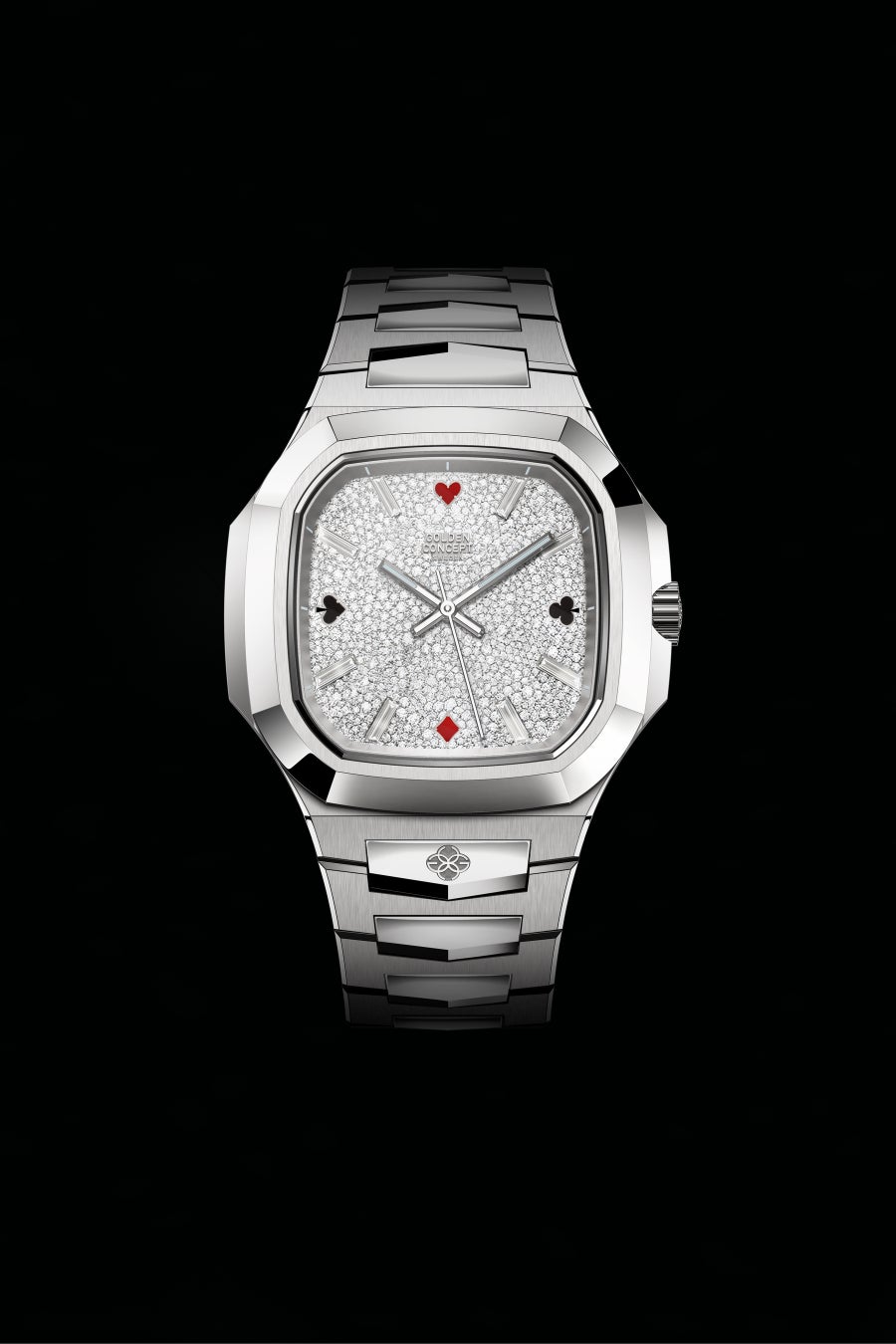 文字盤には、ポーカーを象徴するスペード・ハート・クラブ・ダイヤの4種のスートモチーフをさりげなく配置。さらに、文字盤全体にはラボグロウンダイヤモンドを敷き詰め、煌びやかでありながらも洗練された表情に仕上げています。