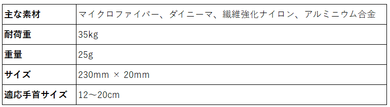 主な素材 | マイクロファイバー、ダイニーマ、繊維強化ナイロン、アルミニウム合金 |