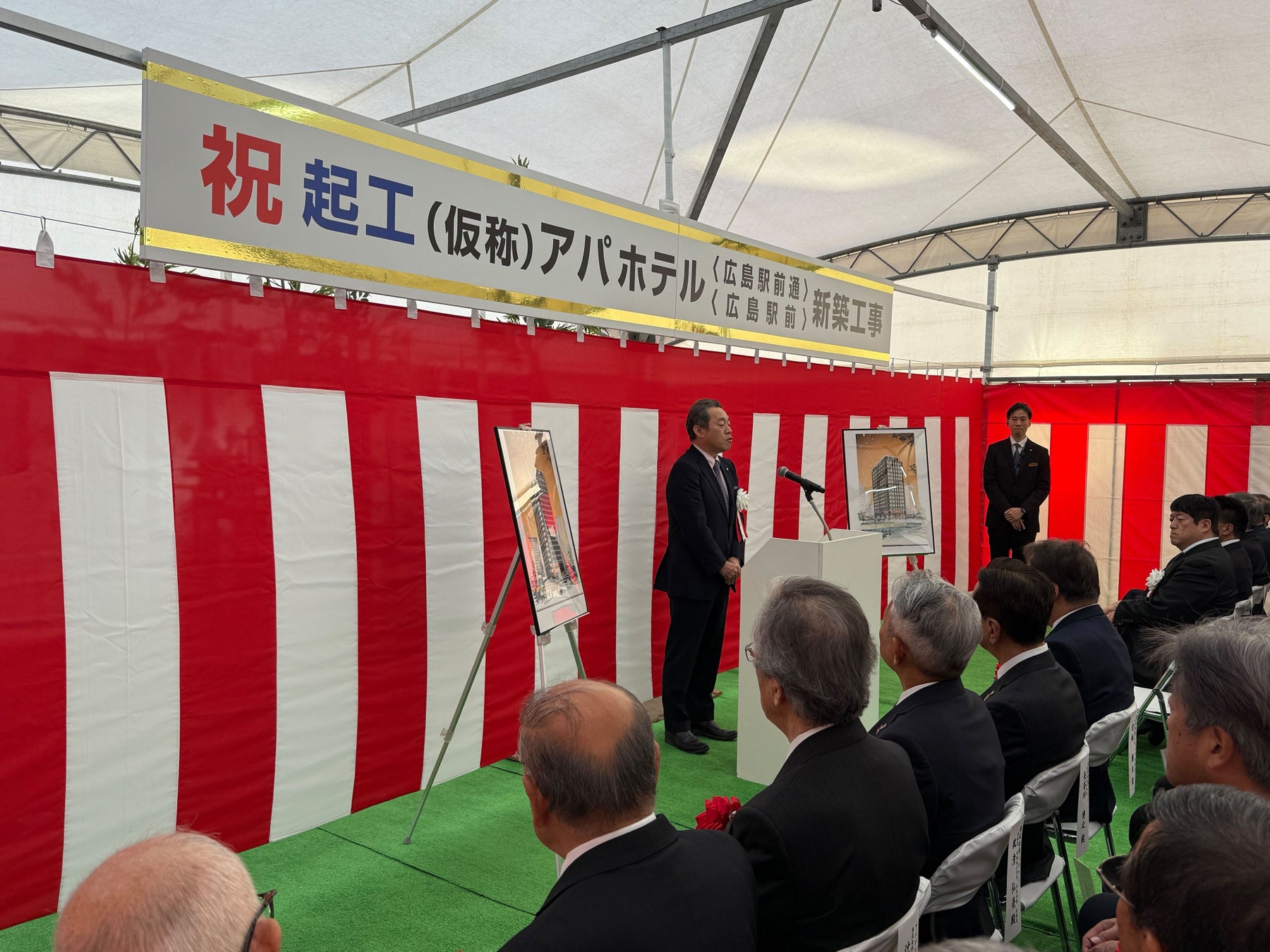 起工式において、アパグループ社長 兼 最高経営責任者(CEO) 元谷 一志は「本日、広島駅前にて2棟同時のダブル起工式を執り行う事となった。現在広島には、既存3棟に加え、今回着工の2棟、そして工事中の広島駅前タワーを含め計6棟を展開している。広島には風光明媚な観光資源や世界遺産、食文化が豊富で訪日客需要も高いため、今後も開発を進め3,000室を目指している。他社との競争力を高めるため、アパホテルはリピーターを確保すべく、常に新しいイノベーションを追求している。きめ細やかな視点を持って改良をしていくことで、アパホテルの仕様をブラッシュアップしていきたいと考えている。ネットワークの拡大も順調で、AIM5の中期目標15万室構想は、現在13万9937室まで進捗している。ブランド戦略としては、従来の「APA」に加え、「the b」や海外ブランドの「COAST HOTEL」、サウナ特化型オールインクルーシブの「アパホテルステイ」ブランドなど、ブランドを多角化し幅広い層を取り込んでいきたい。今後は円安や訪日客増加の波に乗りアパホテルブランドをジャパンブランドとして浸透させたい。当ホテルは地域の方々と共に発展していくことを期待する。」と述べた。