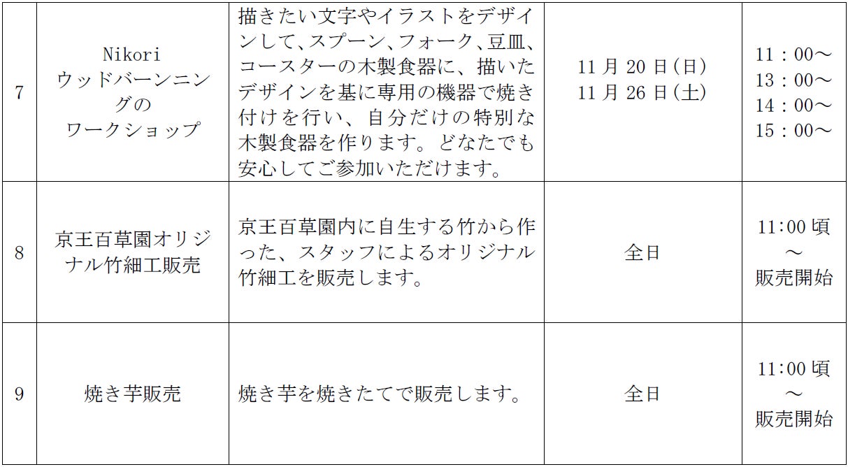 「紅葉まつり」期間中は、土・日・祝日を中心にステージイベントや、木製食器に描きたい文字やイラストを基に専用の機械で焼き付けを行うデザイン体験のワークショップなど大人も子供も楽しめるイベントを行います。また京王百草園オリジナルの竹細工や焼き芋の販売、「百草の歴史を楽しむパネル展」では、鎌倉幕府ゆかりの大寺院真慈悲寺を紹介します。11月19日(土)、20日(日)、23日(水・祝)、26日(土)、27日(日)の16:30から19:00には、3年ぶりに紅葉のライトアップや竹灯篭の展示を実施します。園内では、温かい色のライトに照らされた幻想的な紅葉をお楽しみいただけます。なお、京王百草園で自作の竹灯籠は、個数限定で販売します。