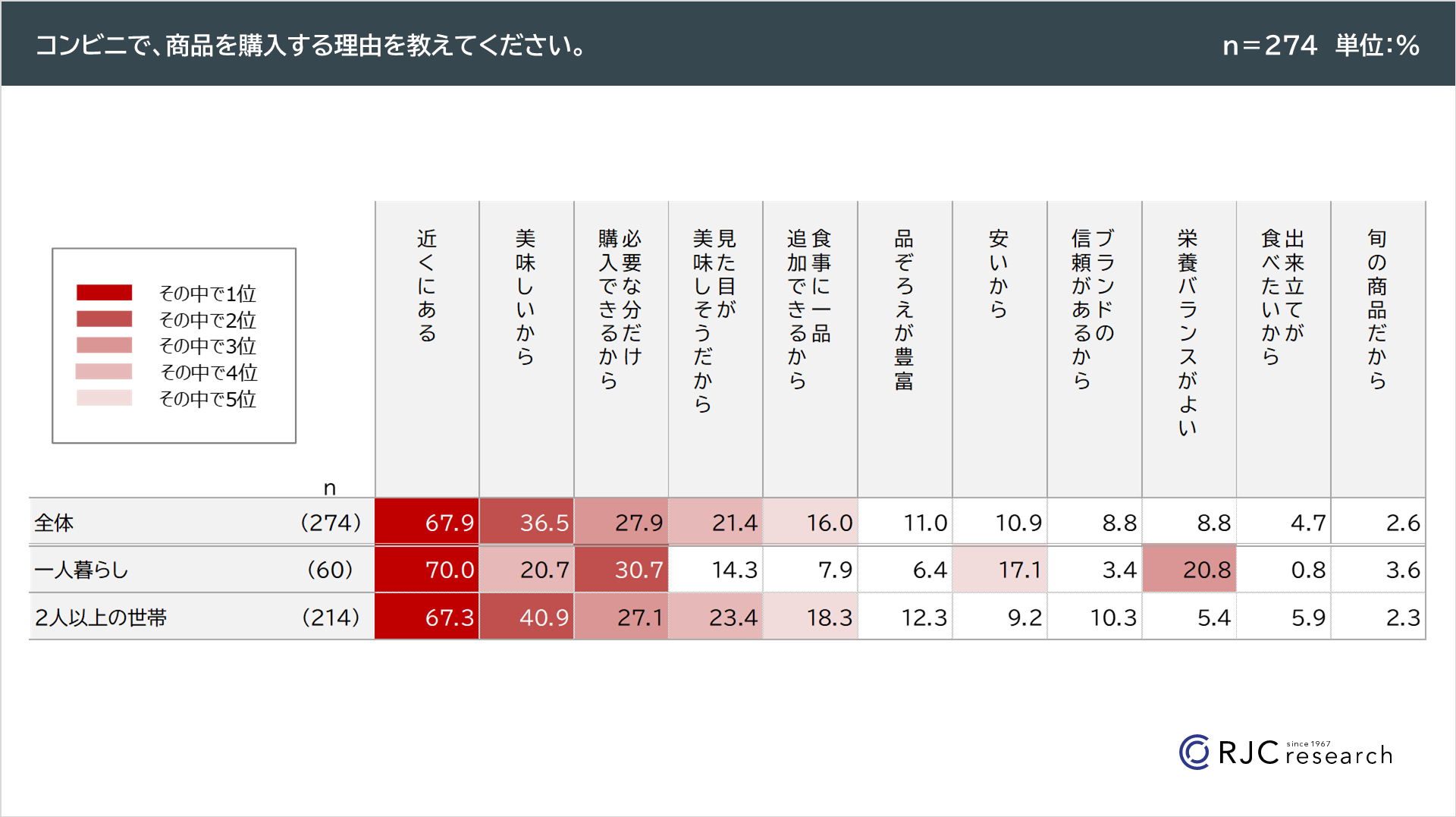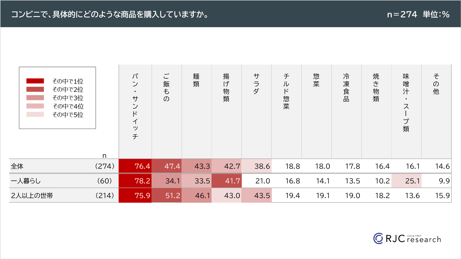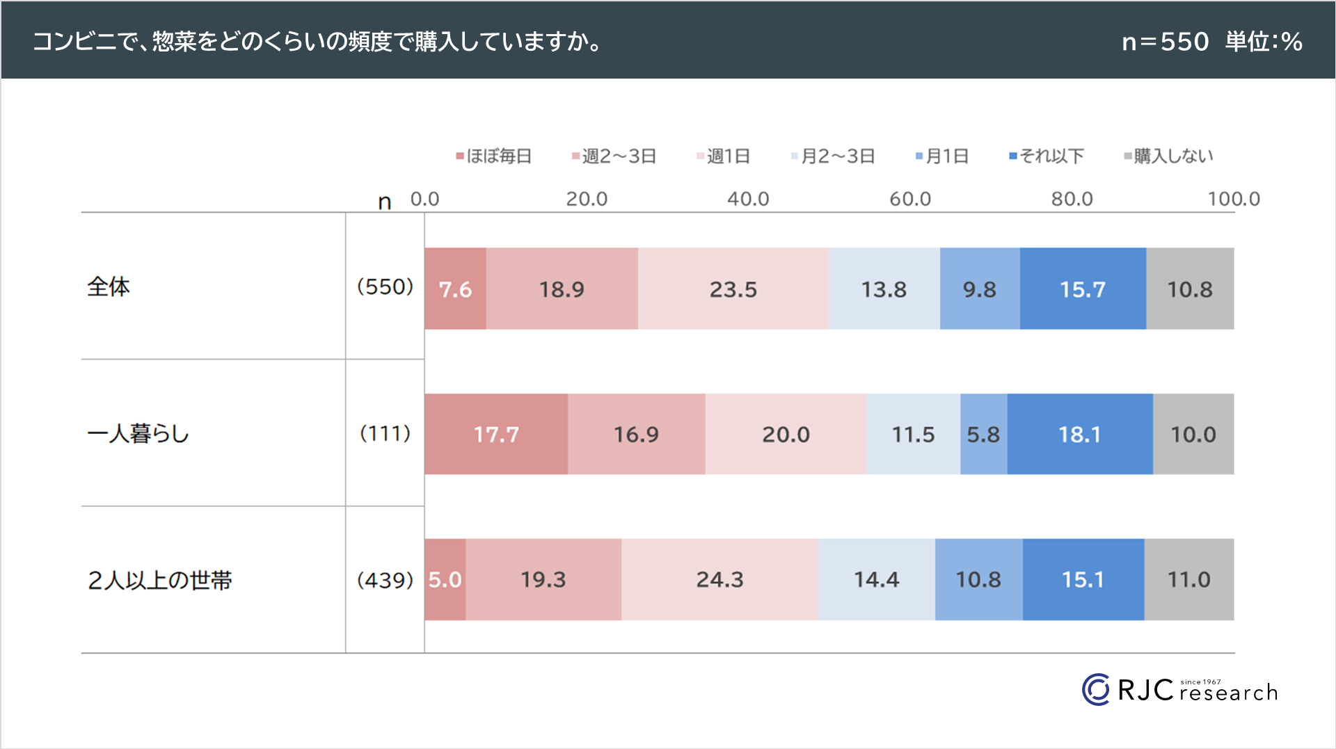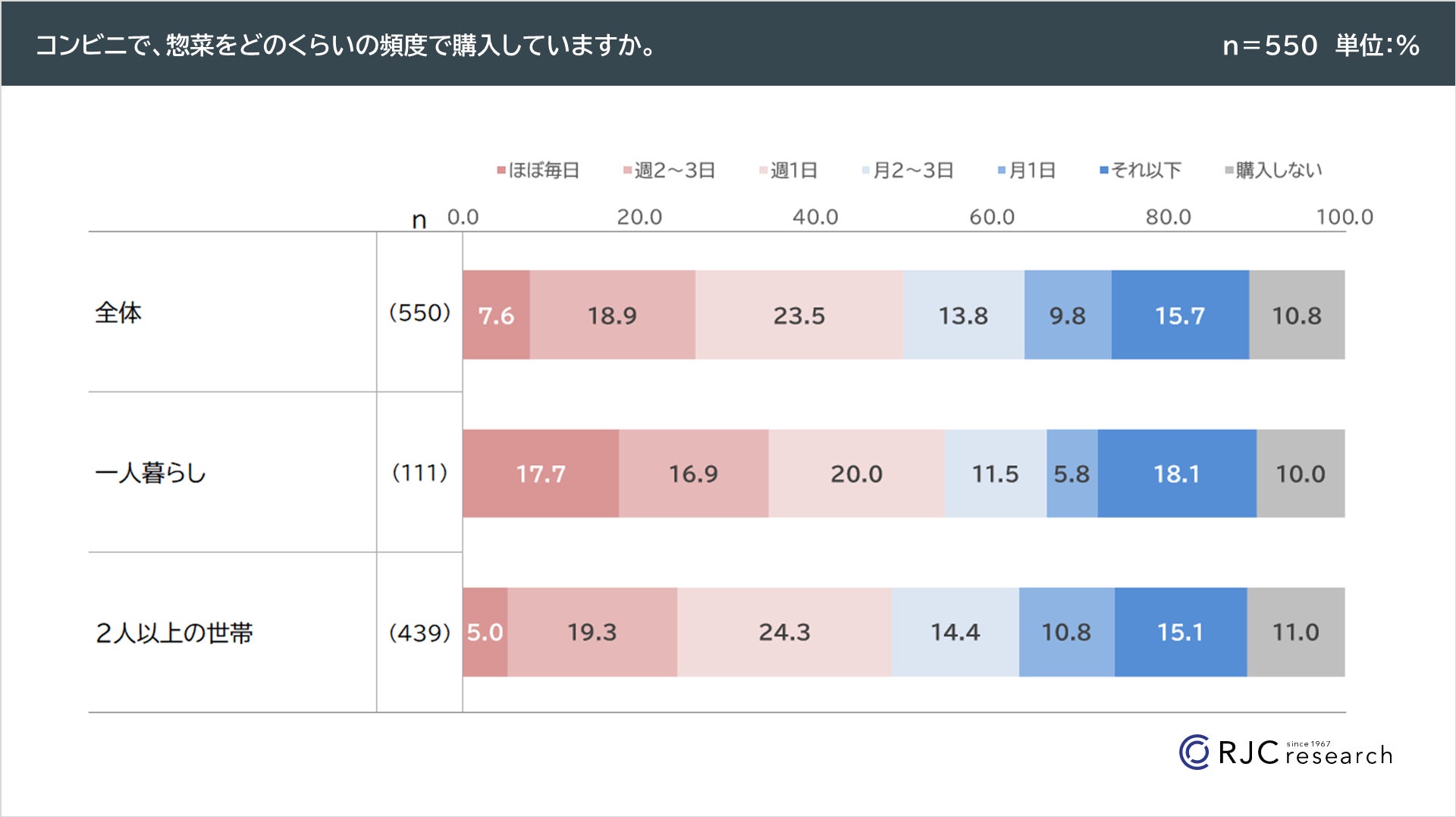 2人に1人が週1以上コンビニエンスストアの惣菜を購入、一人暮らしは “コスパと栄養バランス” 重視、2人以上の世帯は1品追加したい時など “食卓の彩りアップ” に重宝