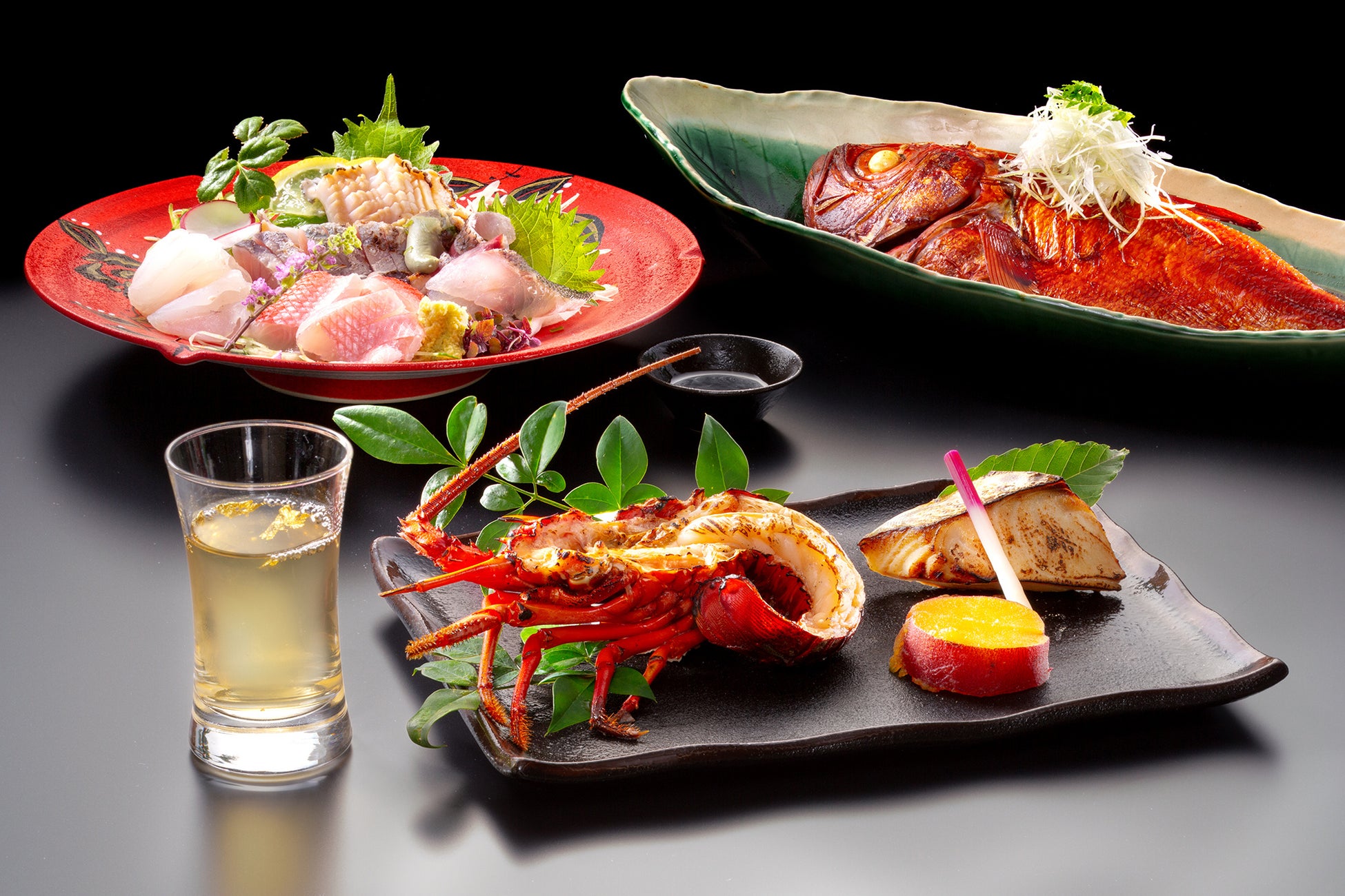 2名1室一人26,000円~ 天城軍鶏、鮑、伊勢海老とブリ幽庵焼、金目鯛の姿煮を堪能
