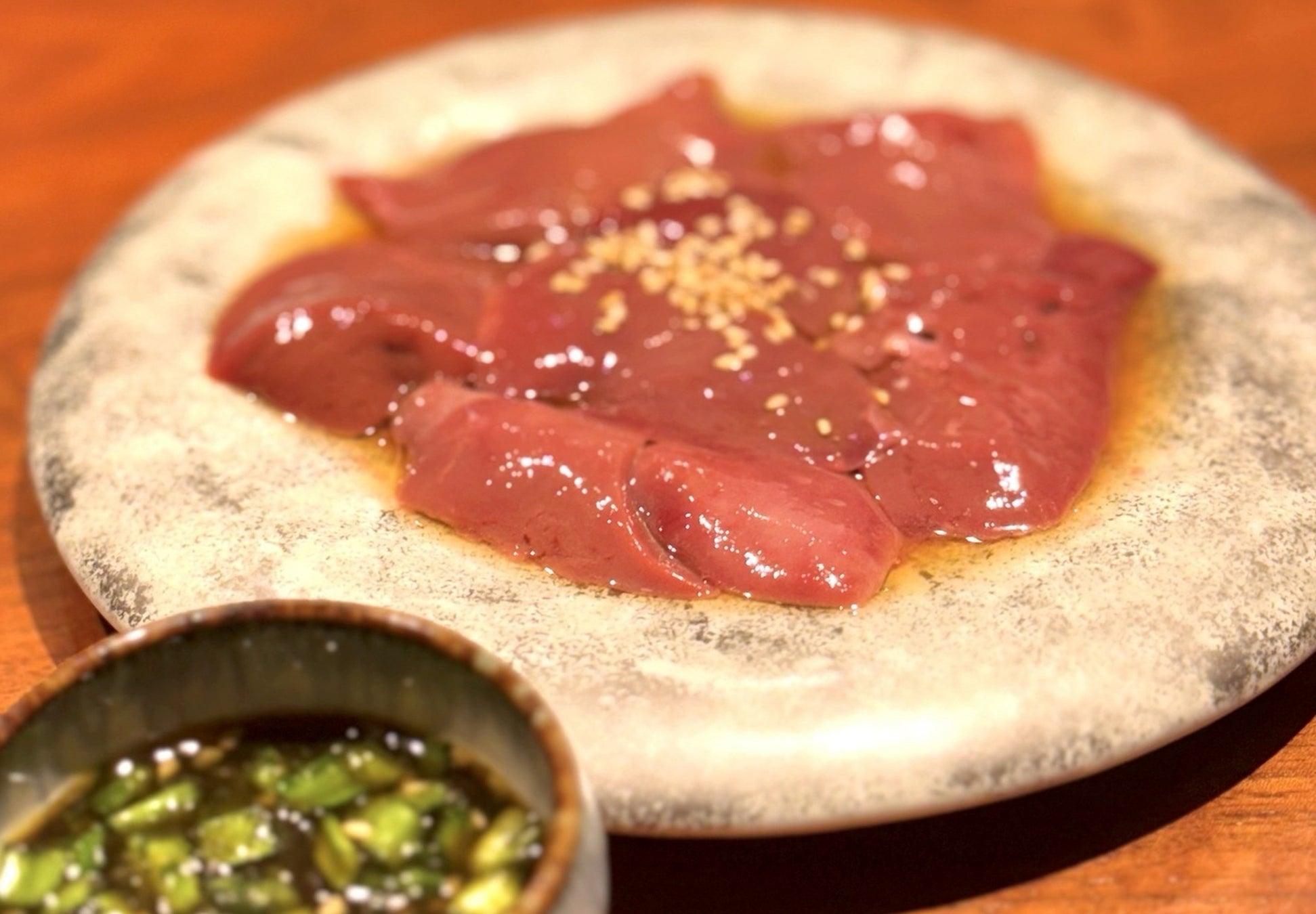新鮮な鶏白レバーを焼いて、特製ニラ醤油でどうぞ!