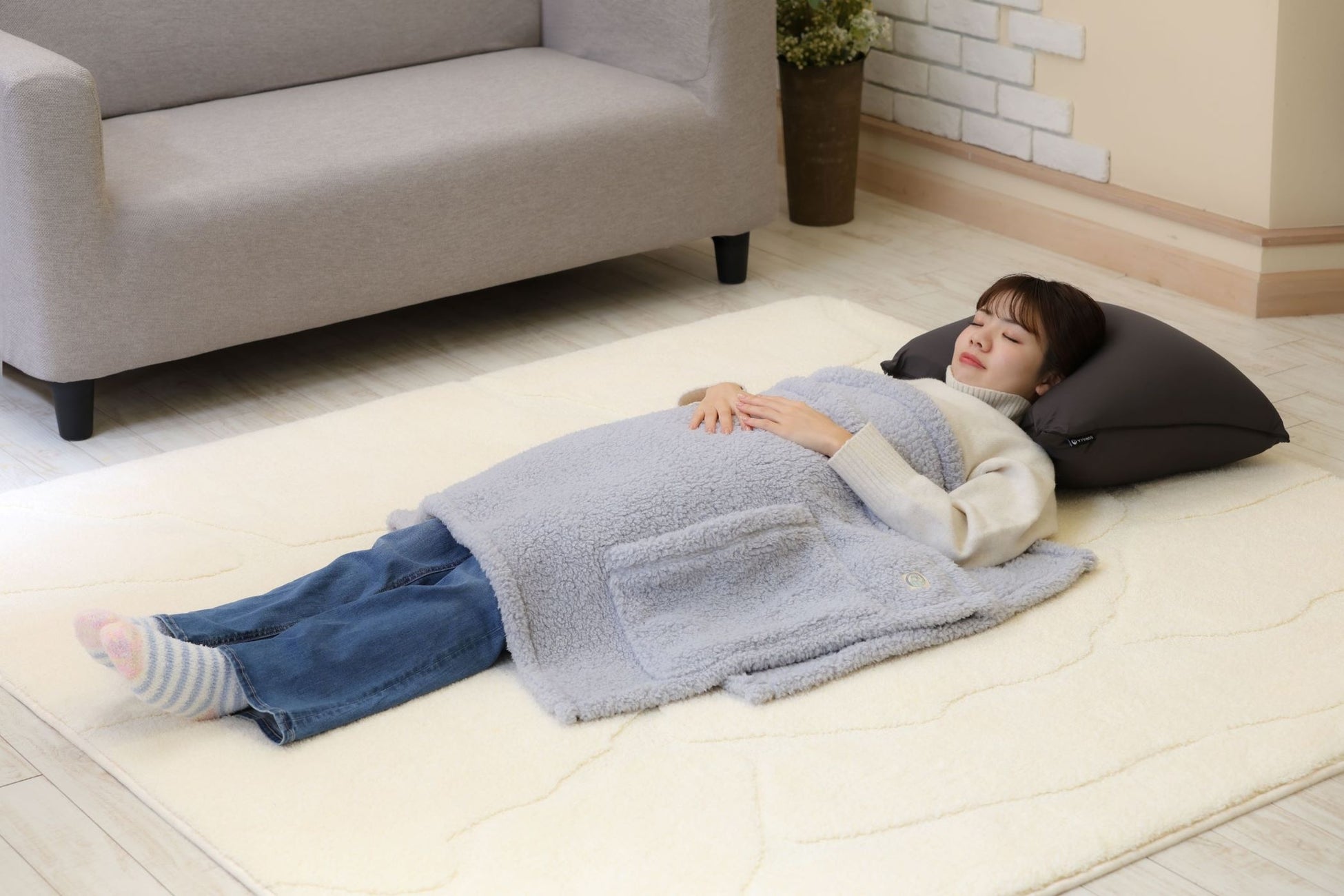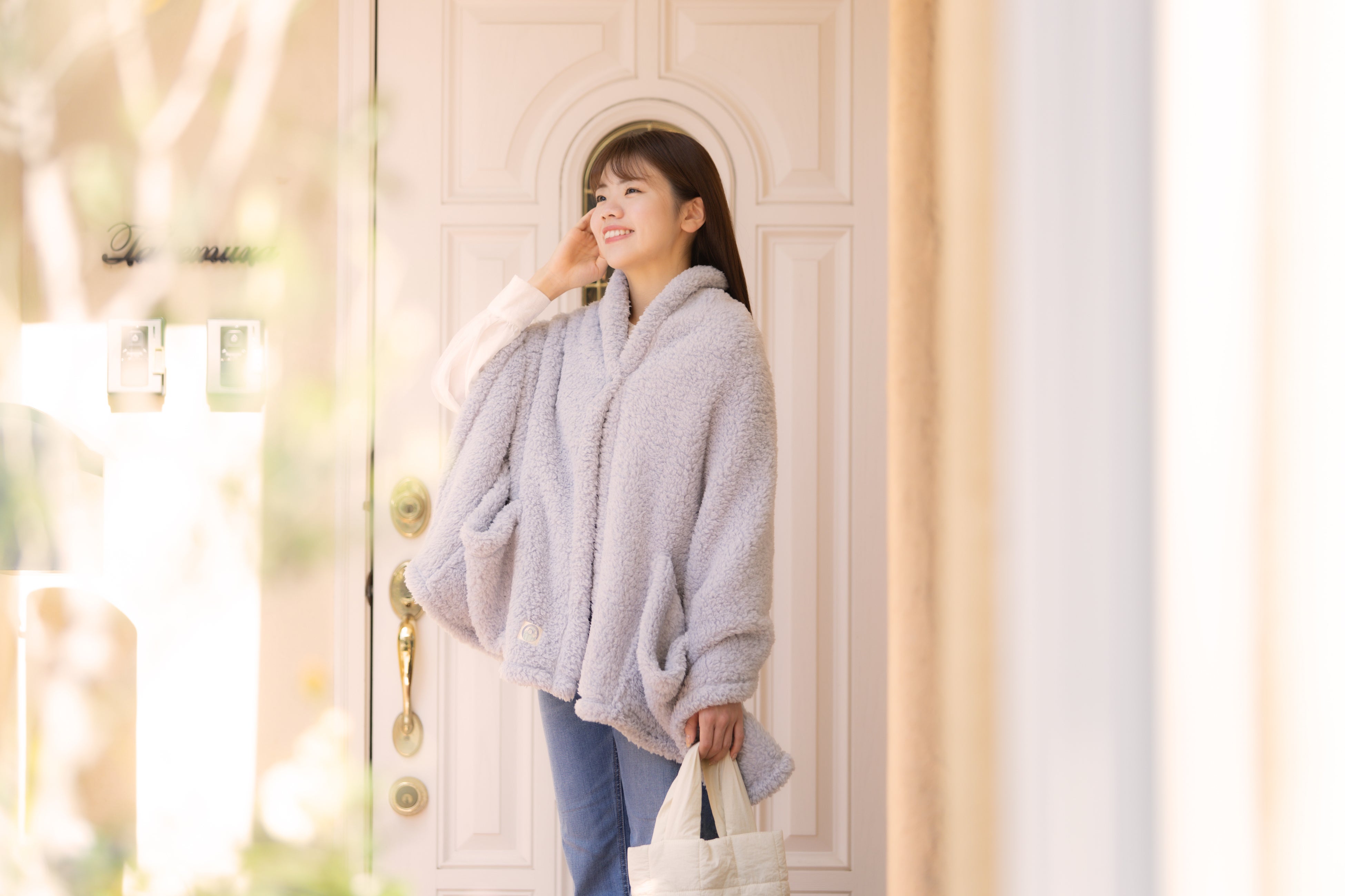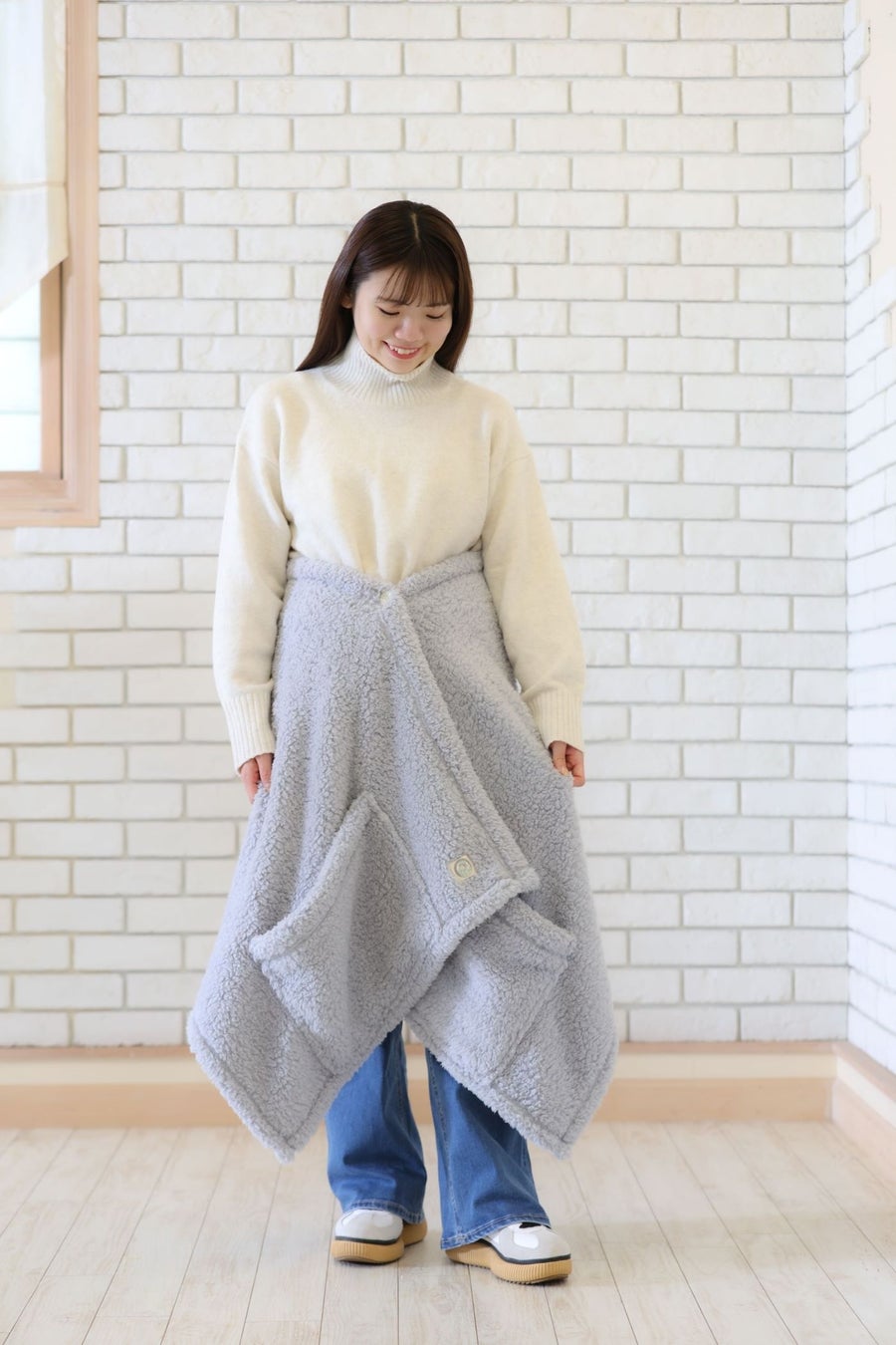 ボタンを留めて肩に羽織ればストールとして、腰に巻けば防寒スカート風に、広げればひざ掛けやお昼寝時におなかをあたためるブランケットとしても使用可能です。室内でのリラックスタイムだけでなく、「ちょっとそこまで」のワンマイルウェアやアウトドアシーンでも活躍します。