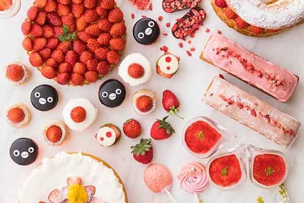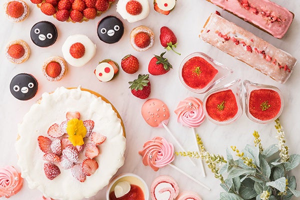 苺をたっぷりと乗せた人気のタルトや、苺とフロマージュブランのヴェリーヌ、桜のネイキットケーキ(苺シロップ)、桜のウィークエンド、苺のパリブレストの他、新作スイーツの苺とライムのゼリー、苺のロマノフ、苺と抹茶のガトーオペラ、苺とピスタチオのバスクチーズケーキなどホテルメイドのスイーツが約20種類お楽しみいただけます。 また人気のシリーズSuicaのペンギン マカロンや、Suicaのペンギン プリンも限定のテイストでご用意いたします。