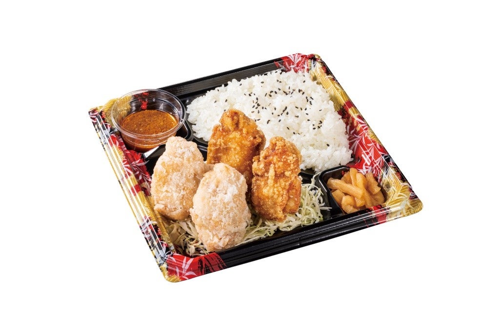 塩からあげ2個、カリッともも2個、千切りキャベツ、ごはん