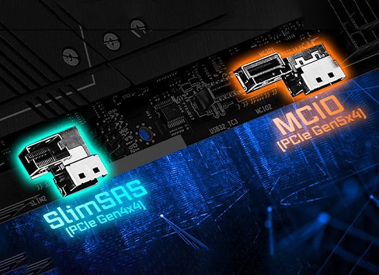 ブレイジングM.2(Mキー、PCIe Gen5x4) ハイパーM.2(Mキー、PCIe Gen4x4) MCIOコネクタ(PCIe Gen5x4 もしくは 4x SATA3 6.0 Gb/s) SlimSAS SFF-8654 コネクタ(PCIe Gen4x4 もしくは 4x SATA3 6.0 Gb/s) SATA3 6.0 Gb/s |