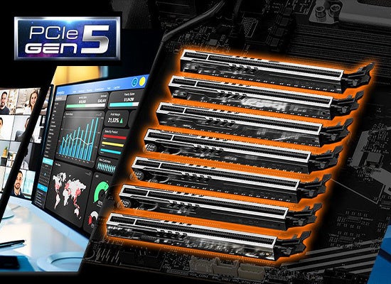 PCIe Gen5 x16スロットを7基、DDR5メモリスロットを8基搭載しており、ディープラーニングやレンダリングアプリケーションなど、様々なプロフェッショナルワークに効果を発揮します。