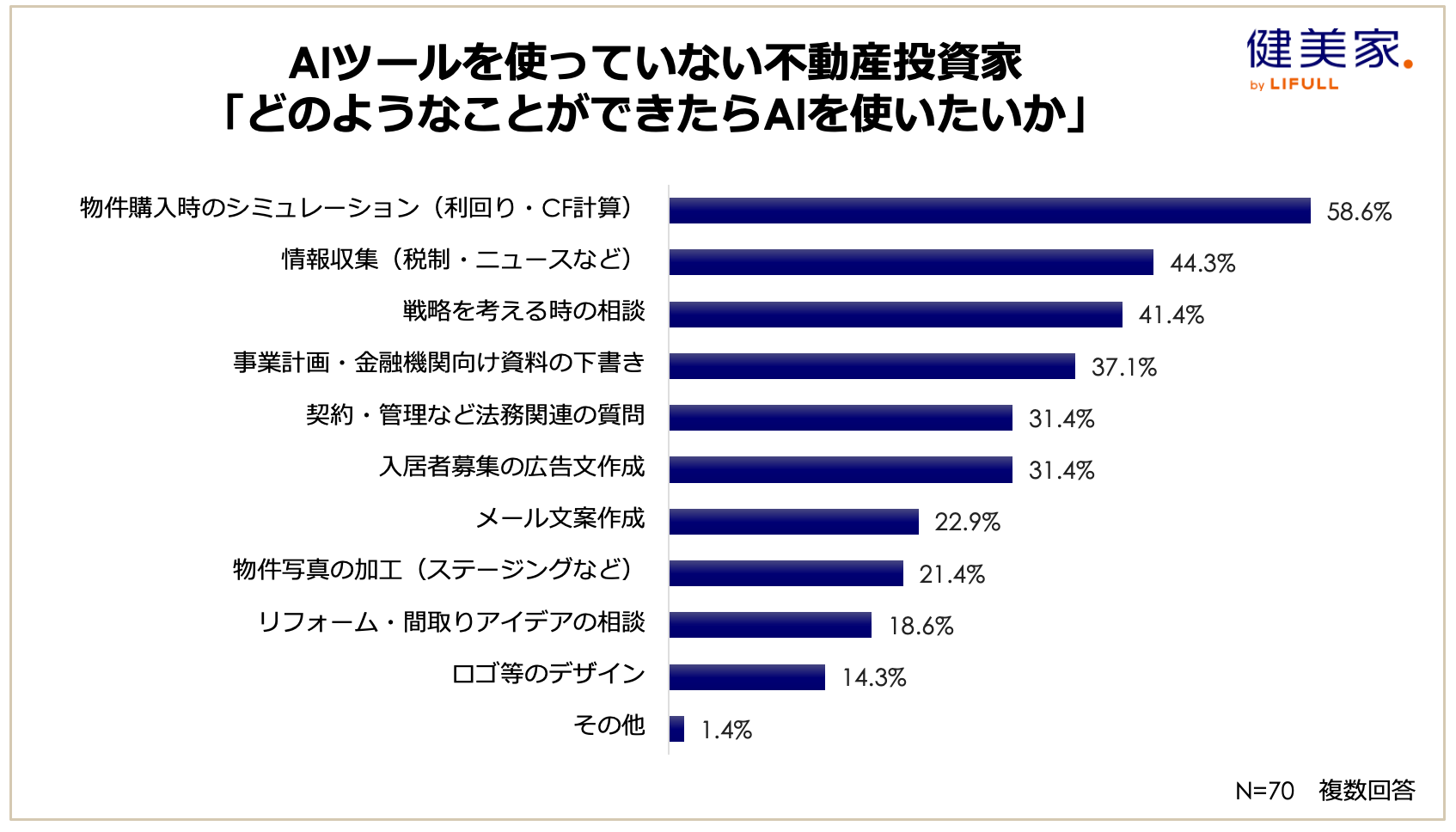 また、本アンケートでは、現在AIを利用していない58%の投資家からも「物件購入時のシミュレーション(利回り・キャッシュフロー計算)(58.6%)」、「情報収集(税制・ニュースなど)(44.3%)」、「戦略を考える時の相談(41.4%)」といった活用意向が寄せられており、潜在的な関心の高さがうかがえます。こうした層が実際の利用へと移行することで、利用率は今後さらに増加していくと考えられます。[図12]