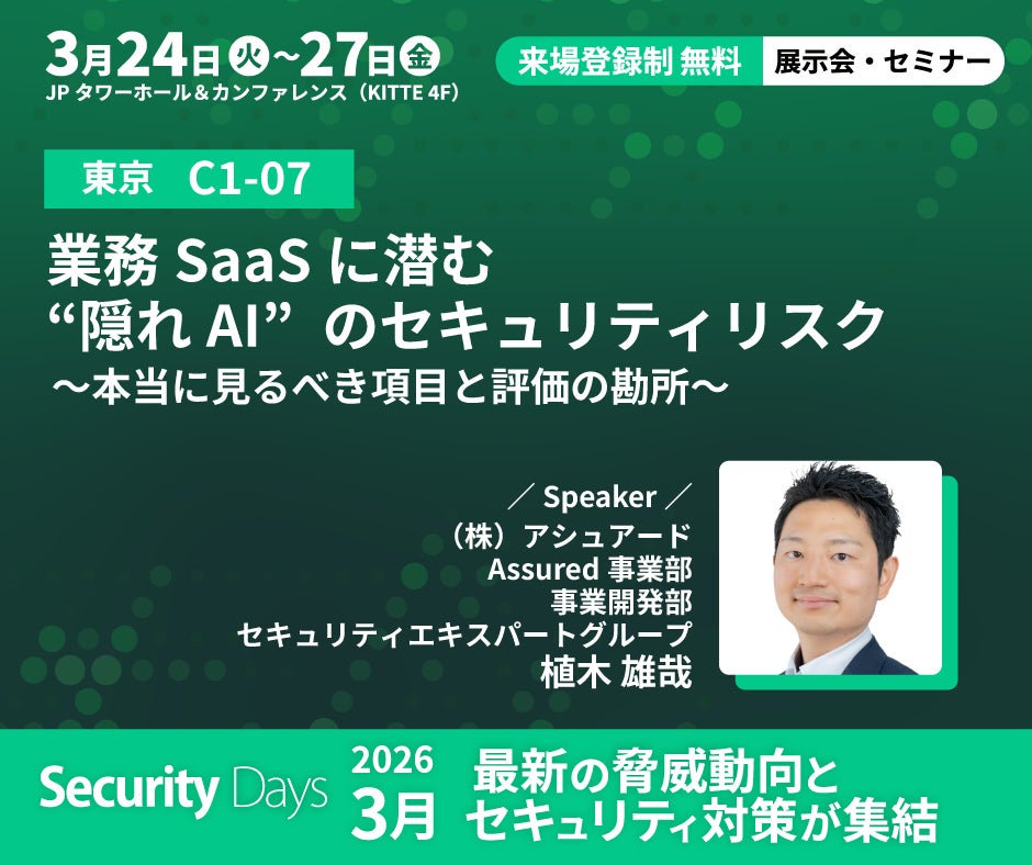 株式会社アシュアード(本社:東京都渋谷区、代表取締役社長:大森 厚志)が運営する、セキュリティの信用評価プラットフォーム「Assured」は、2026年3月24日(火)- 27日(金)に開催される国内最大級のセキュリティ専門イベント「Security Days Spring 2026 Tokyo」へ出展・登壇することをお知らせいたします。