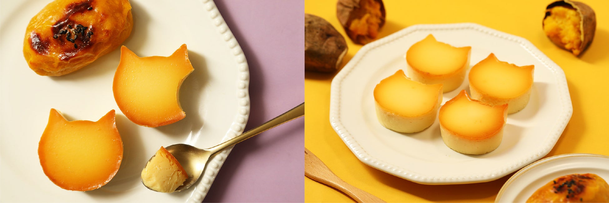 秋といえば、さつまいも。秋においしい”さつまいも”を使用し、食欲の秋をお楽しみいただけるにゃんチーに仕上げました。さつまいもフィリングを使用して、まるでスイートポテトのような味わいに。まろやかなチーズのコクと、さつまいもの優しい甘みを心ゆくまでお楽しみいただける食欲の秋にもぴったりな手のひらサイズのねこ型チーズケーキです。さつまいもがおいしい時期にしかお楽しみいただけない、秋限定のにゃんチーをどうぞご賞味ください。