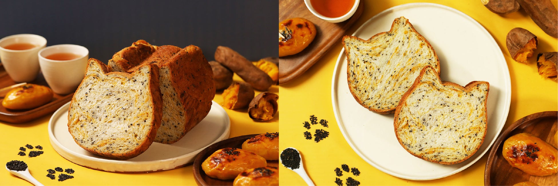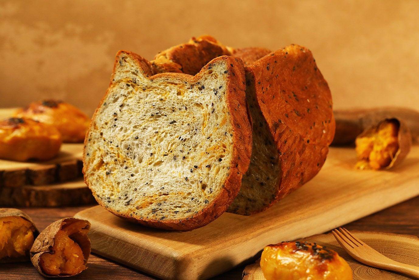 9月フレーバーとして、子供から大人までみんなが大好きなスイーツ”スイートポテト”をイメージしたフレーバーが登場いたします。香ばしい黒ごまを練り込んだミルク100%の生地に、安納芋ペーストを練り込んで焼き上げました。安納芋の甘みがぎゅっと詰まった味わいとまろやかなコクは、まるでスイートポテトを食べているような味わい。ミルキーでしっとりもっちりとした生地と安納芋の甘み、黒ごまの香ばしさが合わさった三位一体のおいしさをお楽しみいただけるねこねこ食パンで、秋の訪れをお楽しみください。