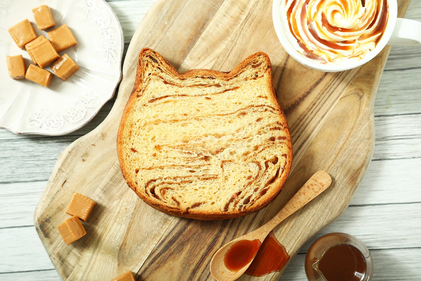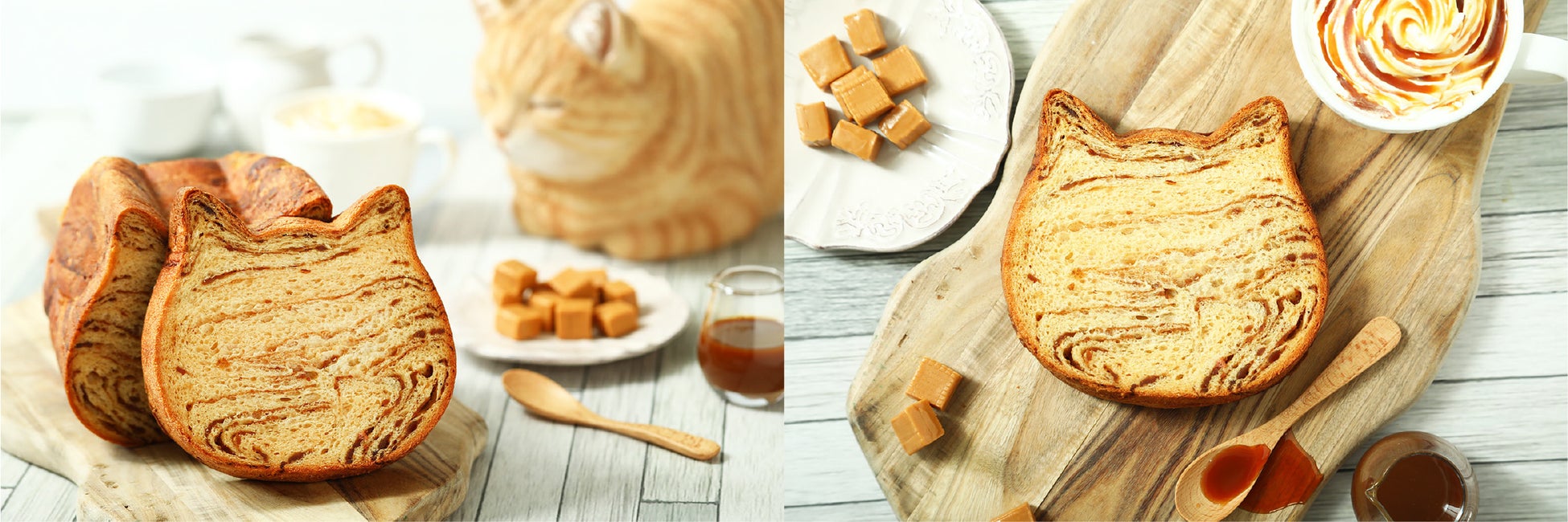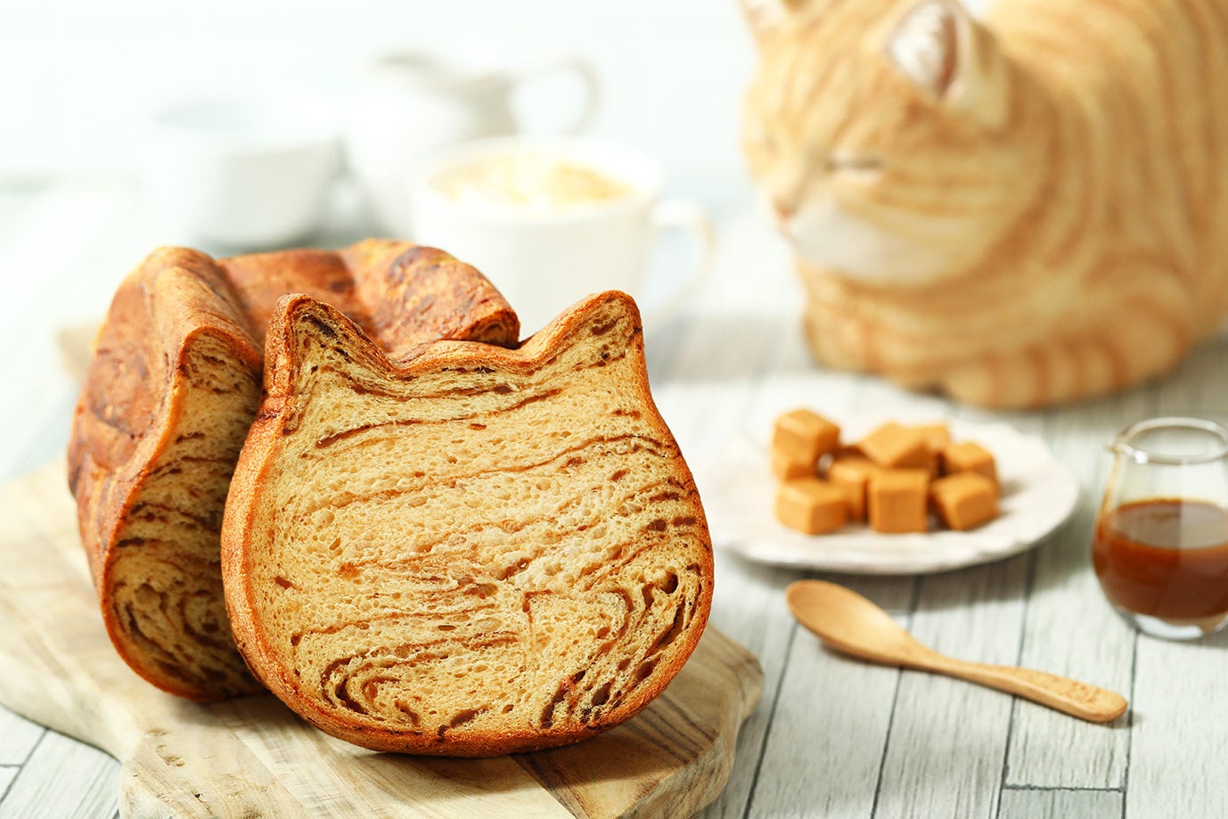 9月1日(金)「茶トラ猫感謝の日」に合わせて、茶トラが好きな方に向けて開発いたしました。そんな特別な日を記念してねこちゃん柄の最新作をオンラインストアで展開、キャラメルで”茶トラ”柄を再現したねこねこ食パンです。