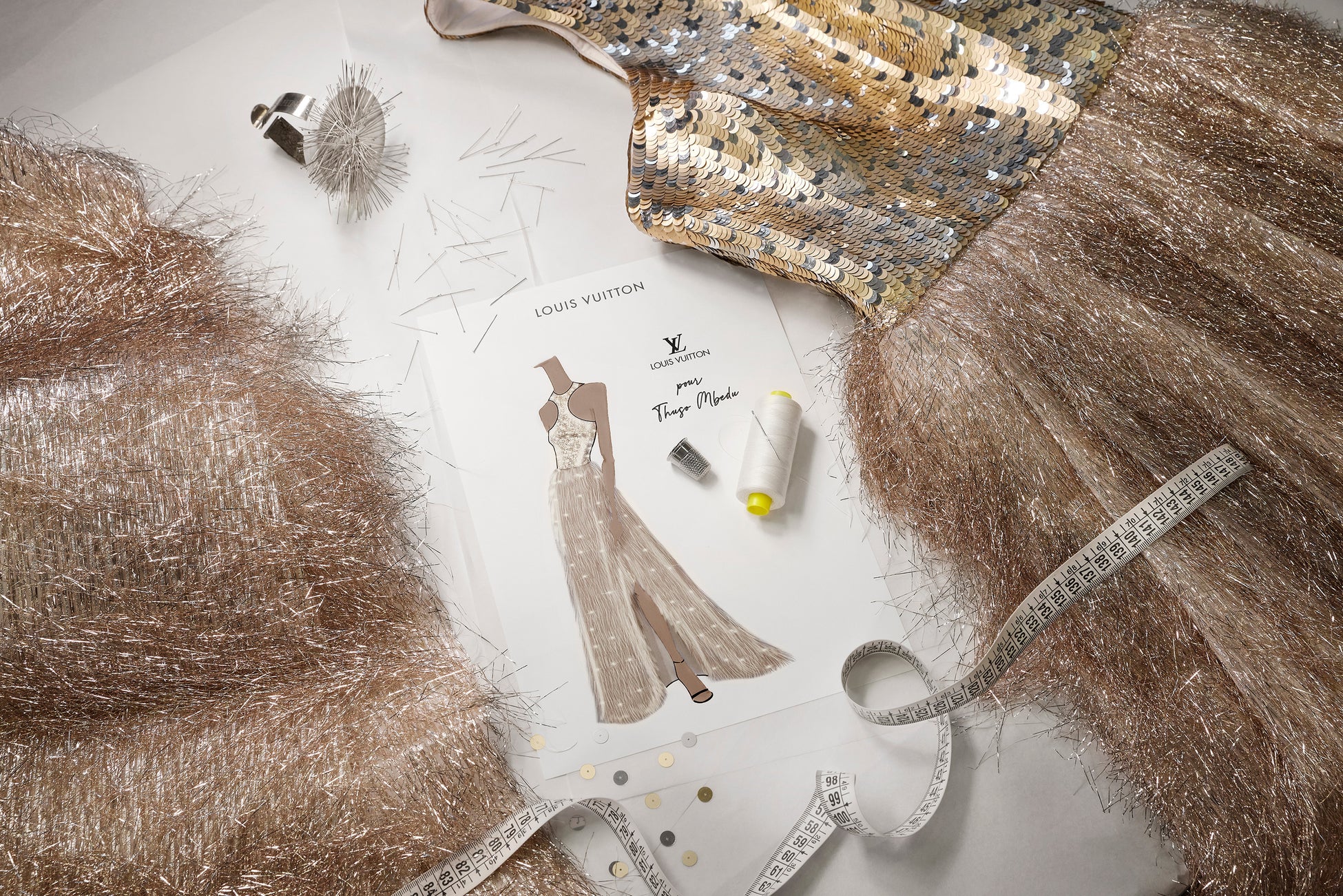 第76回カンヌ国際映画祭にて、トゥソ·ムベドゥが、ルイ·ヴィトンのドレスにハイジュエリーをコーディネートして出席しました。スパンコールトップが特徴的なラメフランジドレスには、カスタムメイドの刺繍入りがほどこされ、また、ゴールド、プラチナにルビーとダイヤモンドをセッティングしたハイジュエリーコレクションのブレスレットとリングを着用しました。