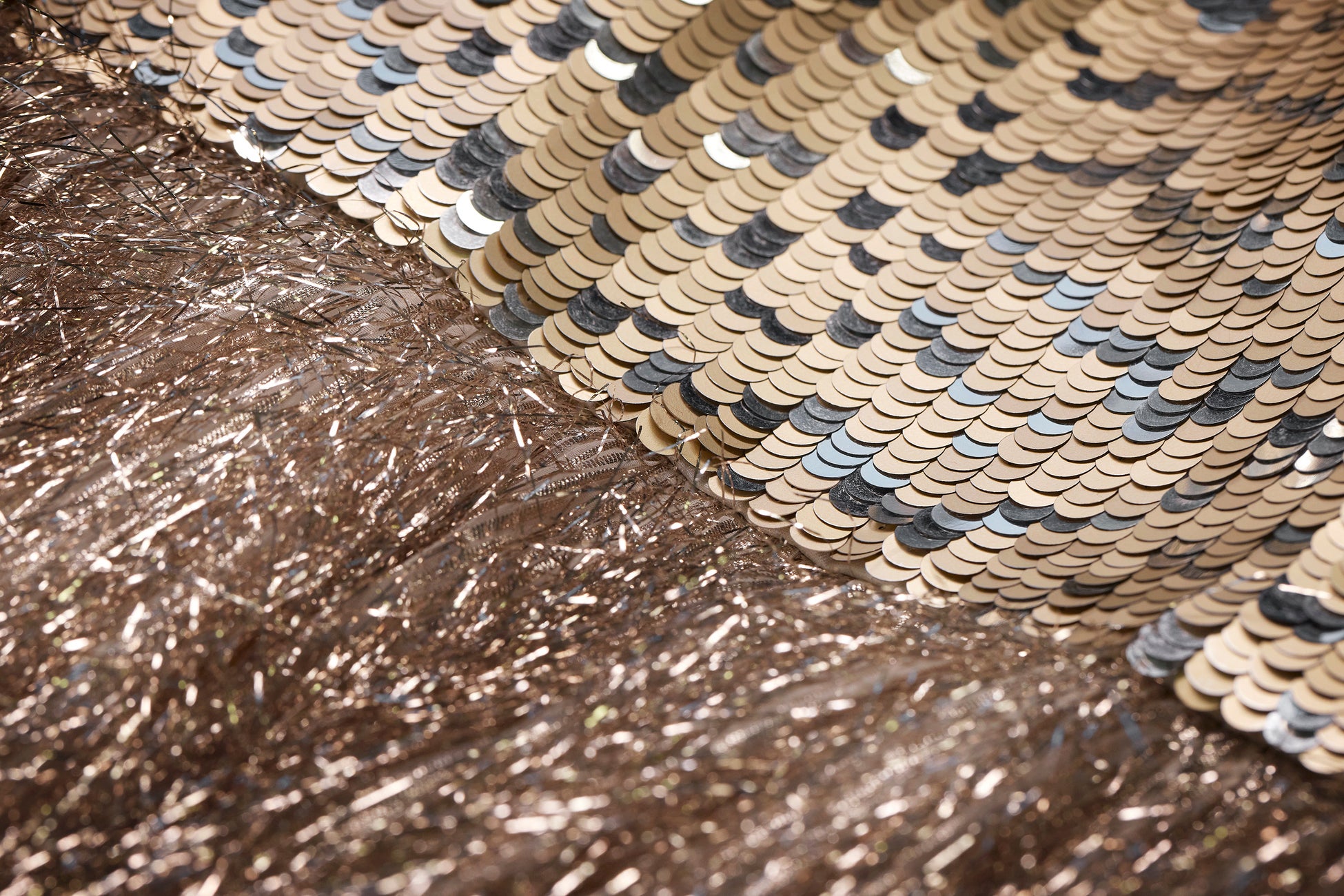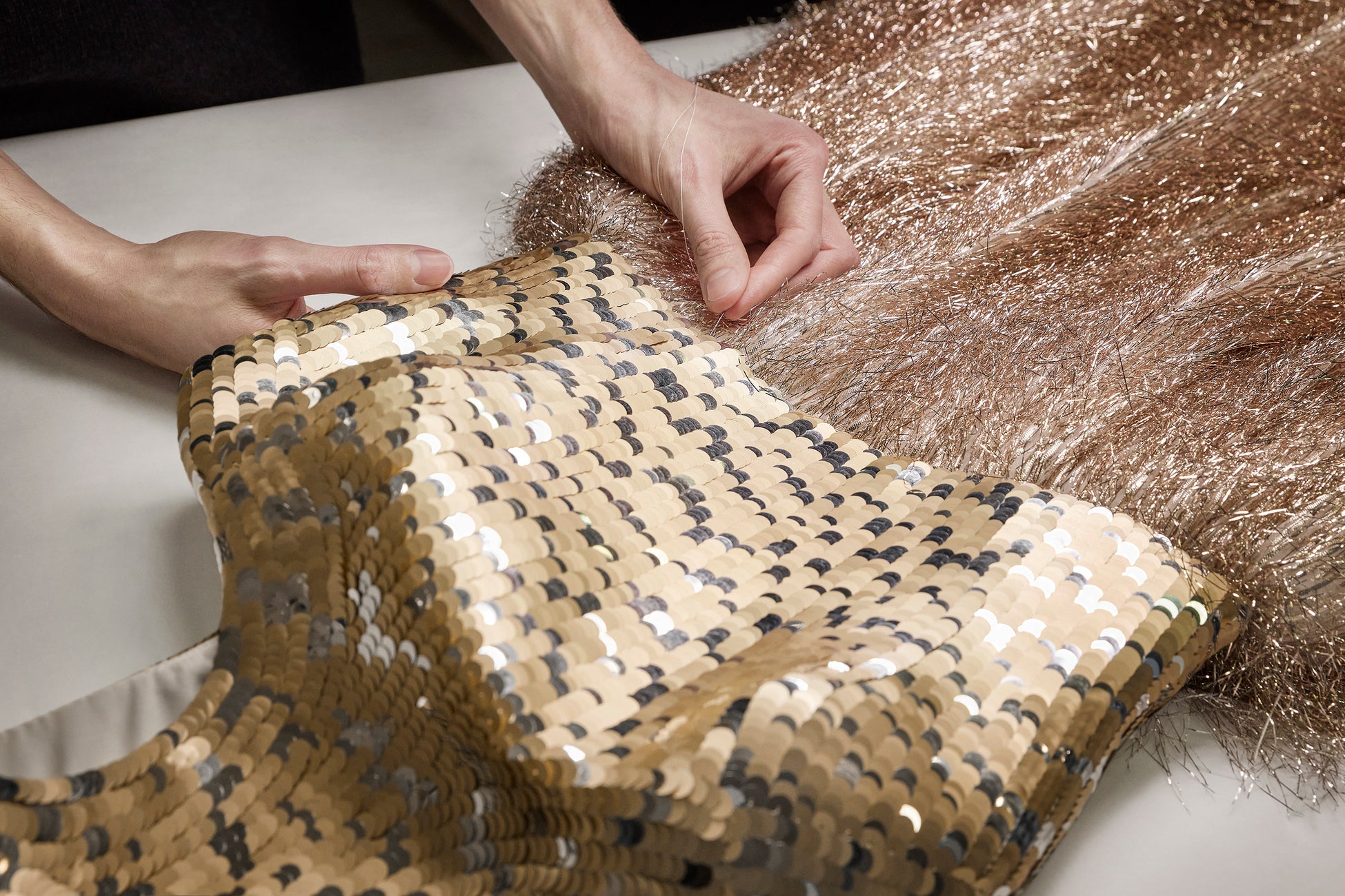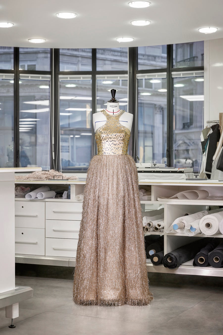 マットで光沢のあるゴールドのスパンコールが刺繍されたドレスは 、スカートはオーガンジーにルレックスフリンジをあしらい、ウエストにフィットさたボリュームプリーツのデザインで約200 時間をかけて制作されました。